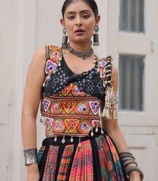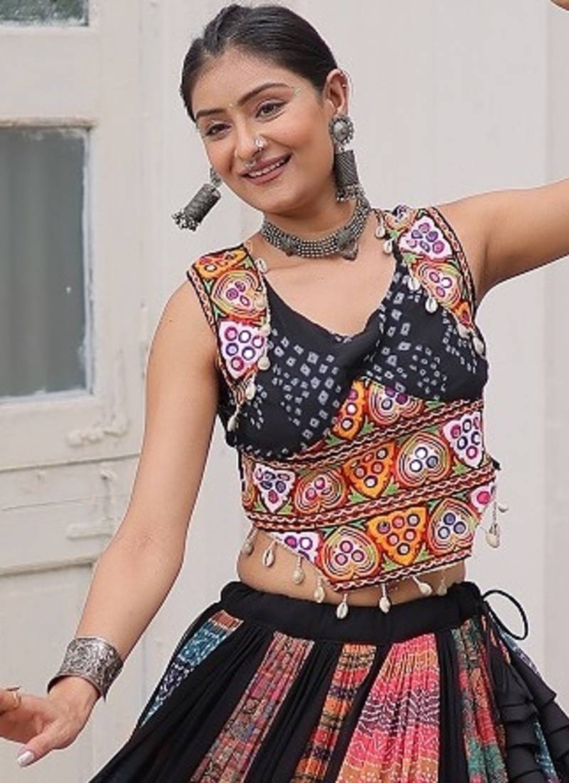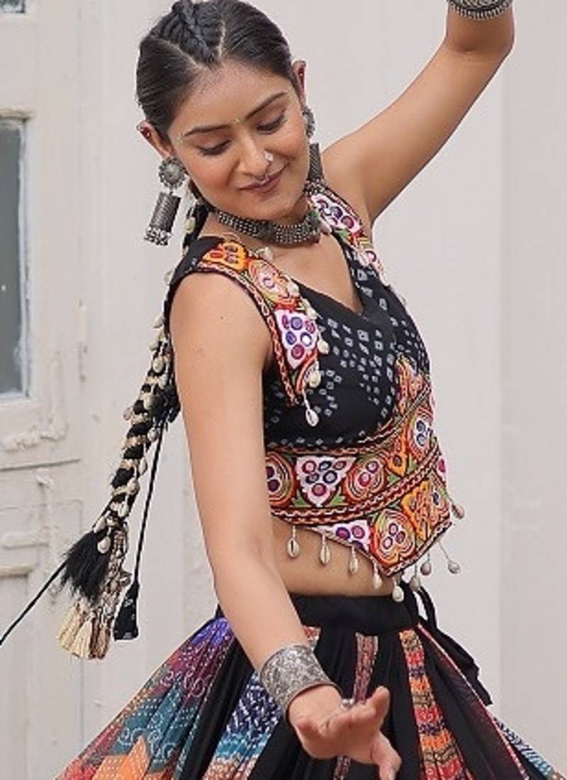 Black color print gamthi embroidered work lehenga choli