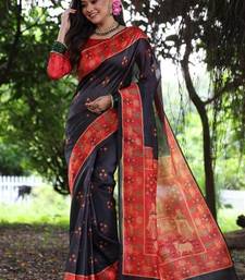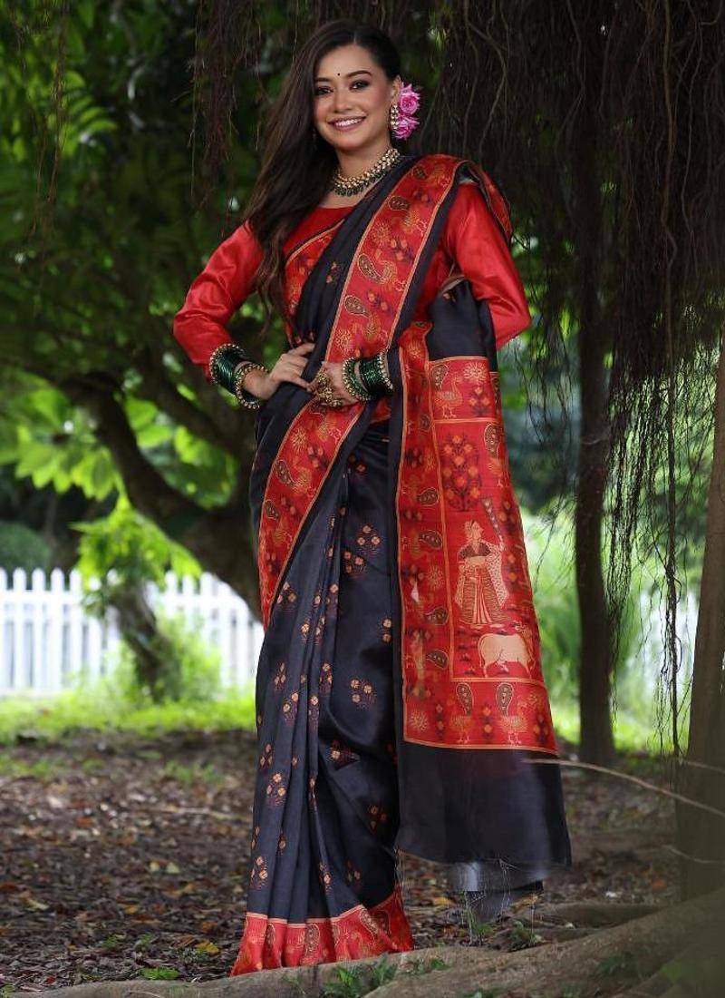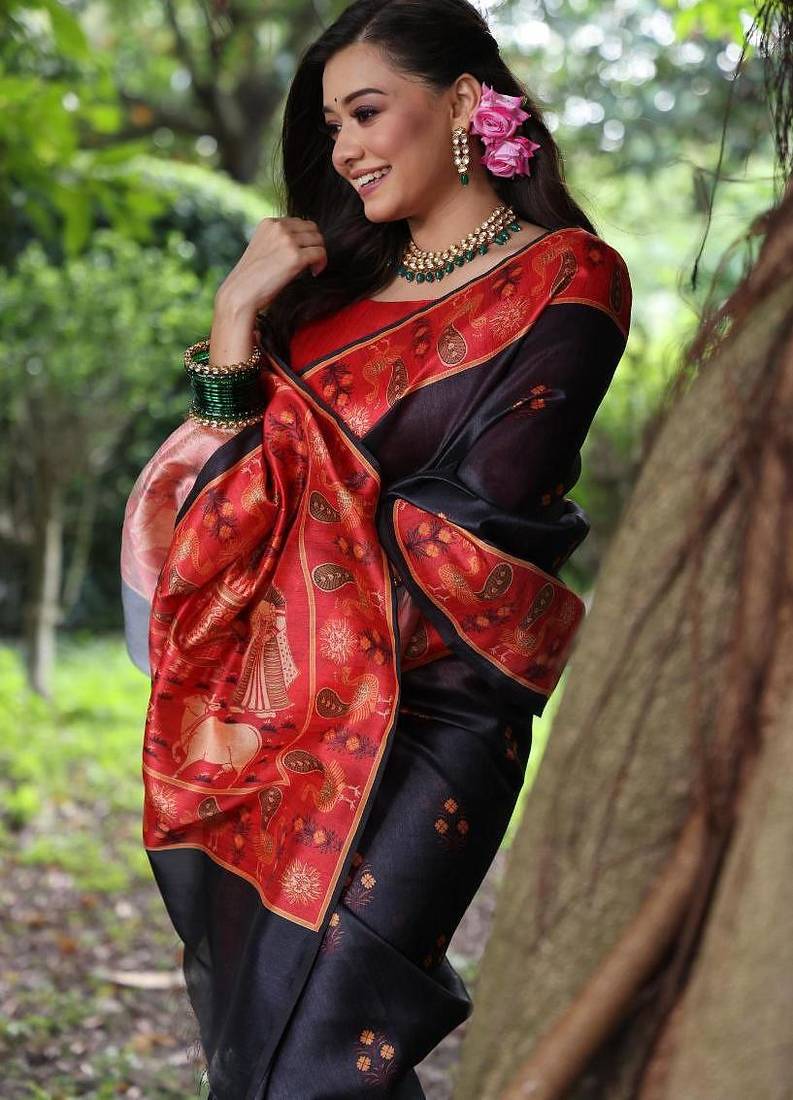 | Product Name | Black Color Raw Silk Peacock Printed Saree | |