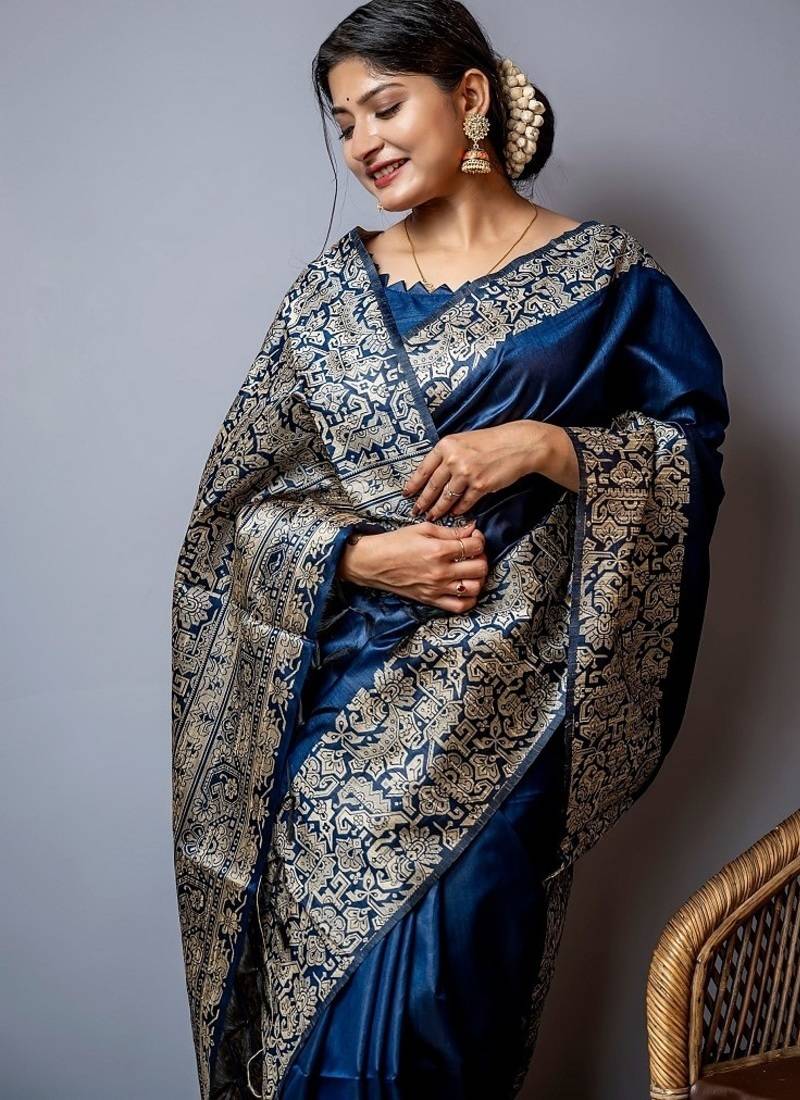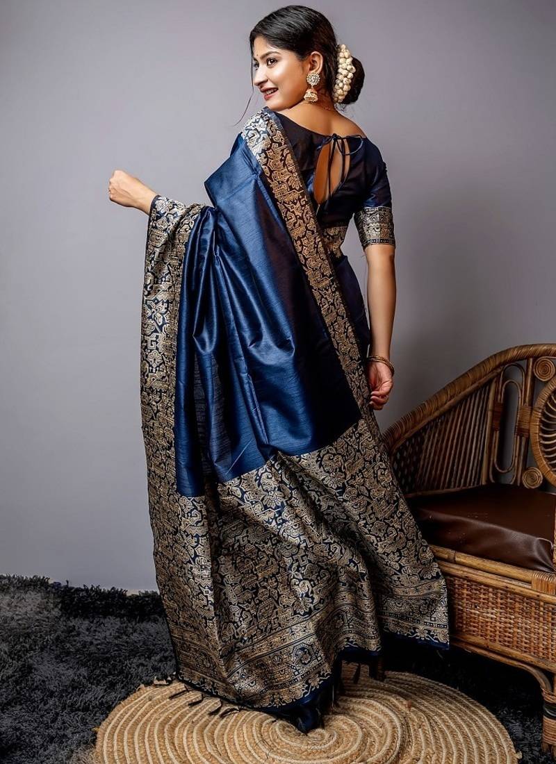 Blue color handloom raw silk weaving pallu saree