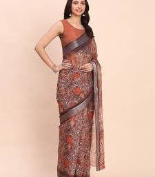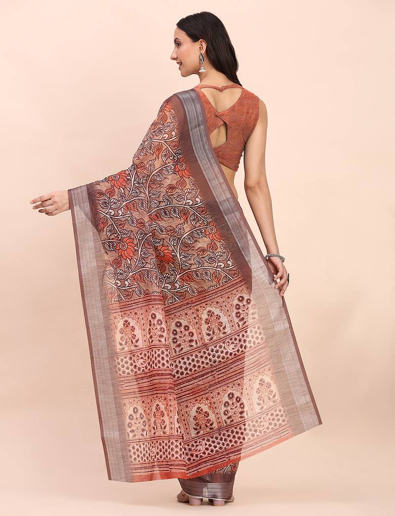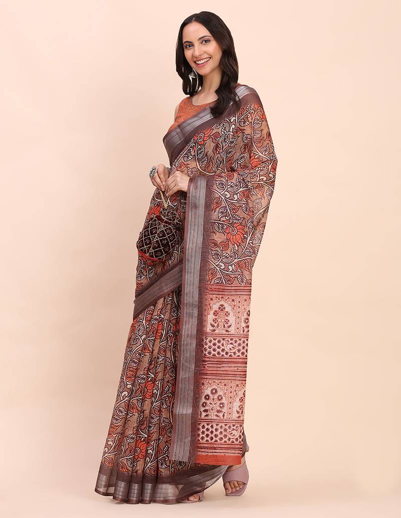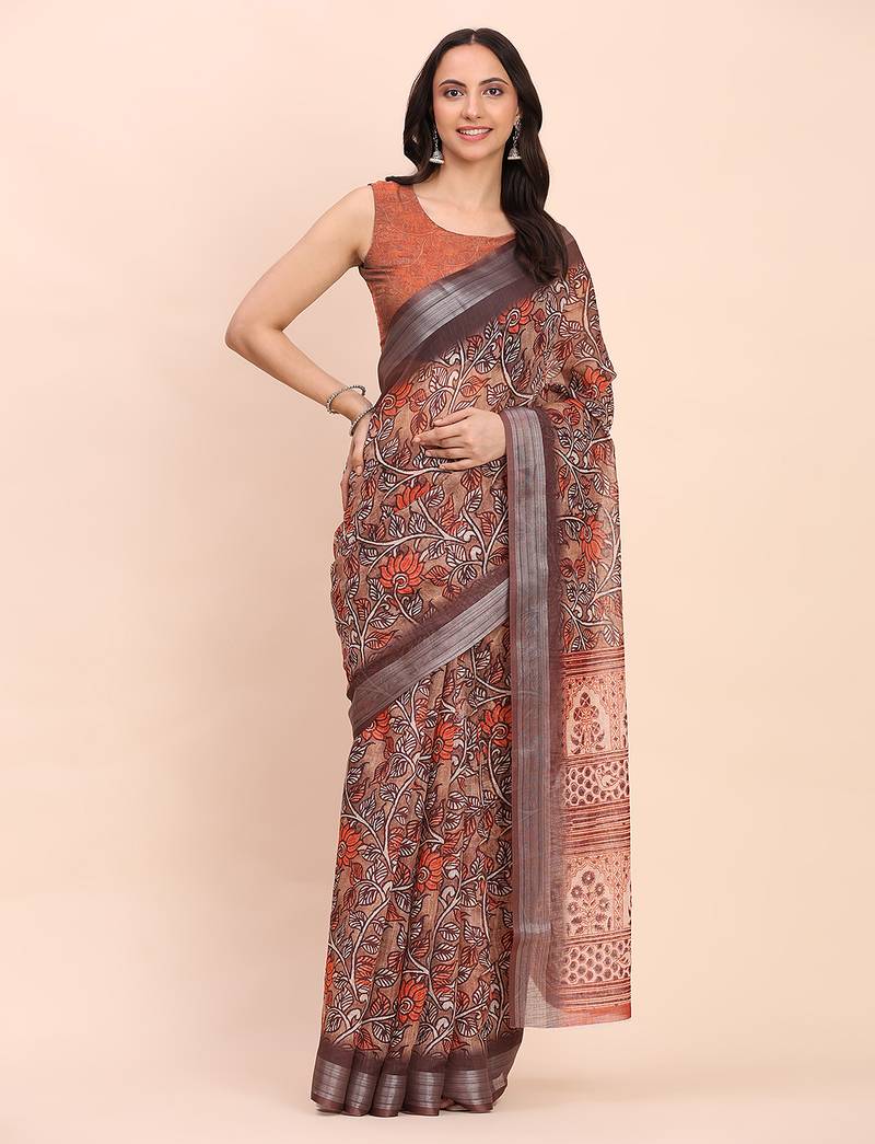 | Product Name | Brown Color Digital Print & Zari Border Linen Cotton Saree | |