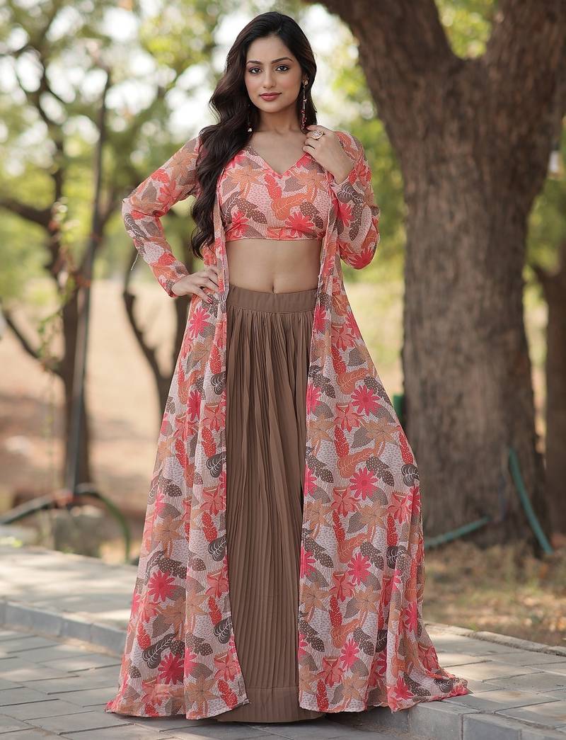 Coffee color faux georgette lehenga choli shrug