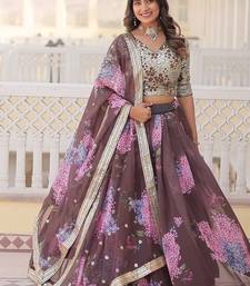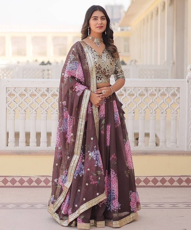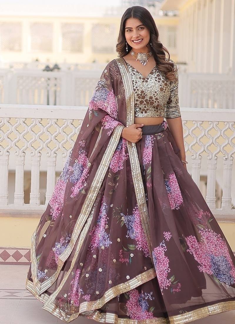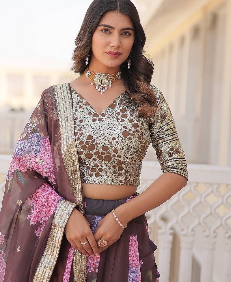 Coffee color russian silk printed sequins work lehenga choli with dupatta