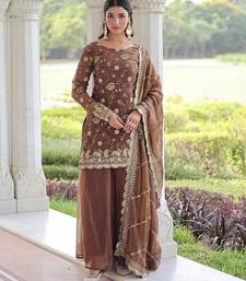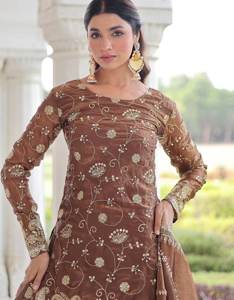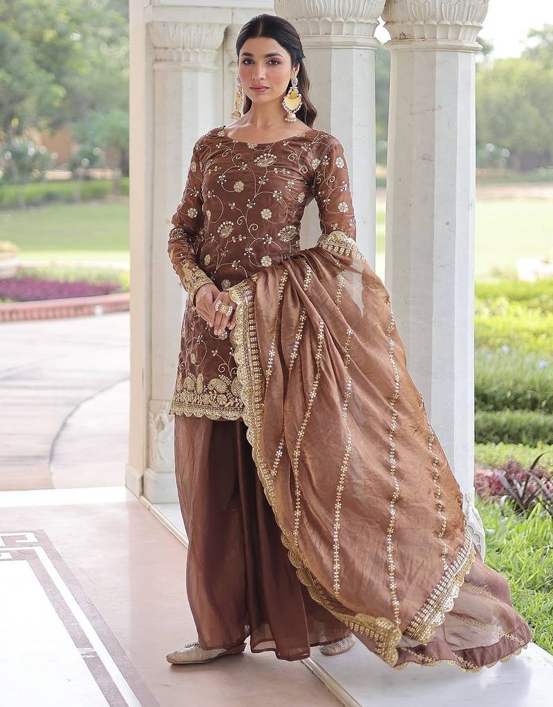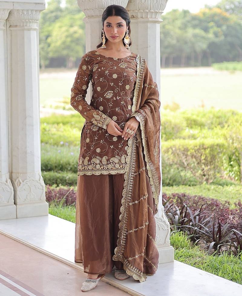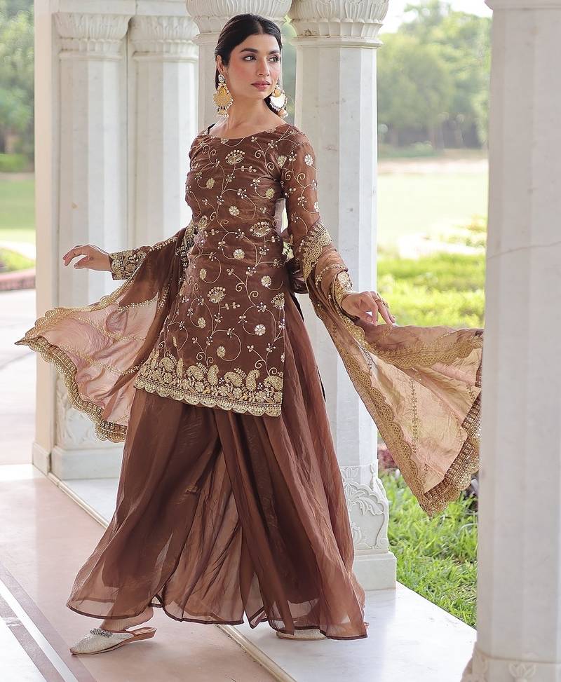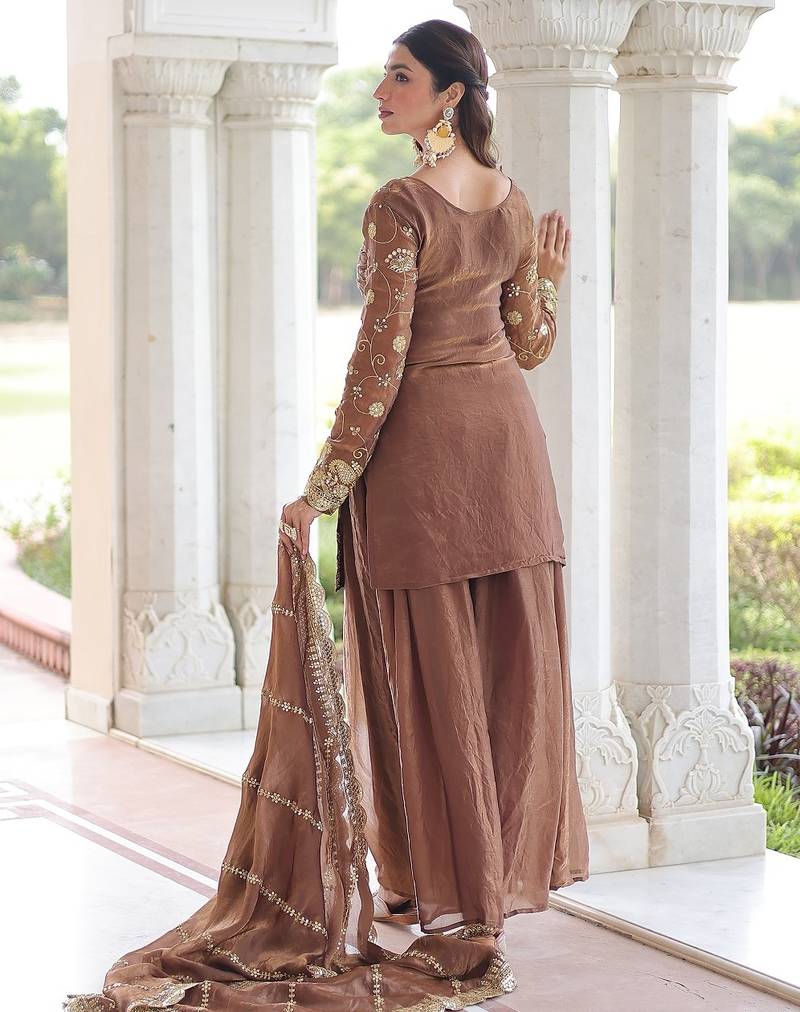 Coffee color sequins work fendi silk designer readymade top-sharara-dupatta stitched