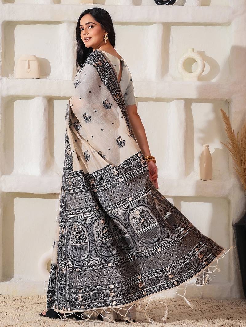 Cream & black color linen cotton saree with blouse