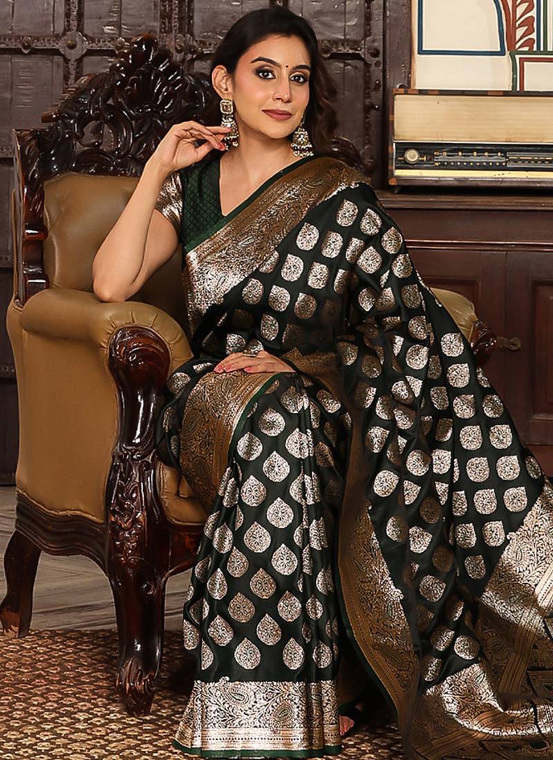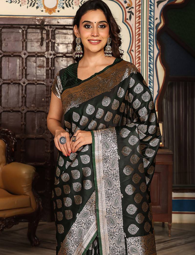 Dark green color zari woven silk blend saree with un-stitch blouse