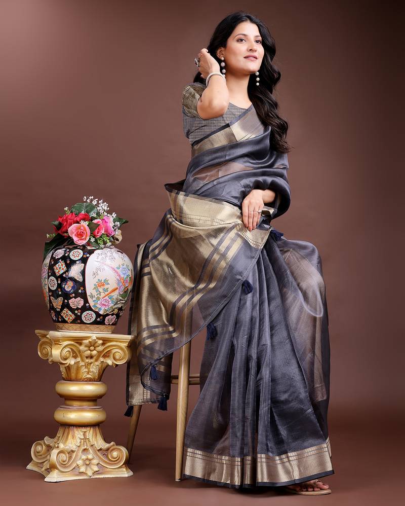 | Product Name | Grey Color Solid Zari Border Plain Orgenza Saree | |