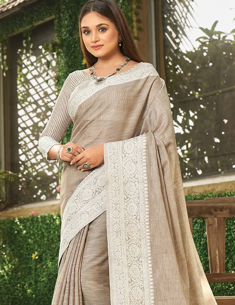 Light brown solid with woven border linen saree