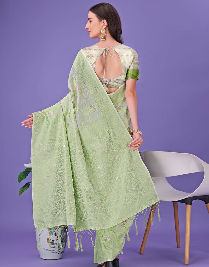 Light green color linen cotton woven saree with blouse
