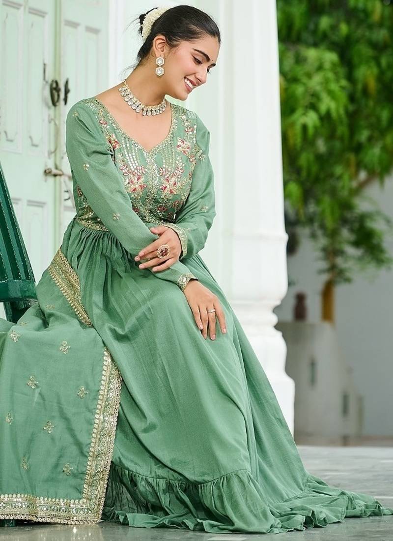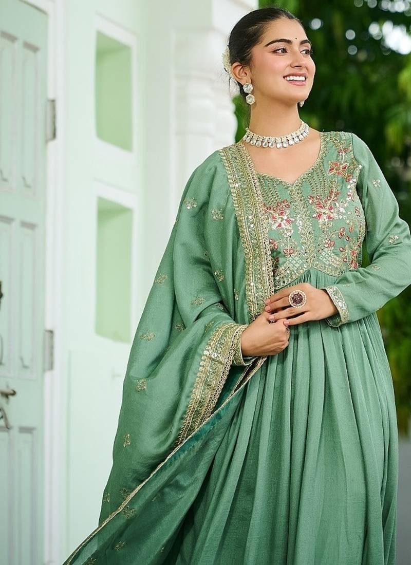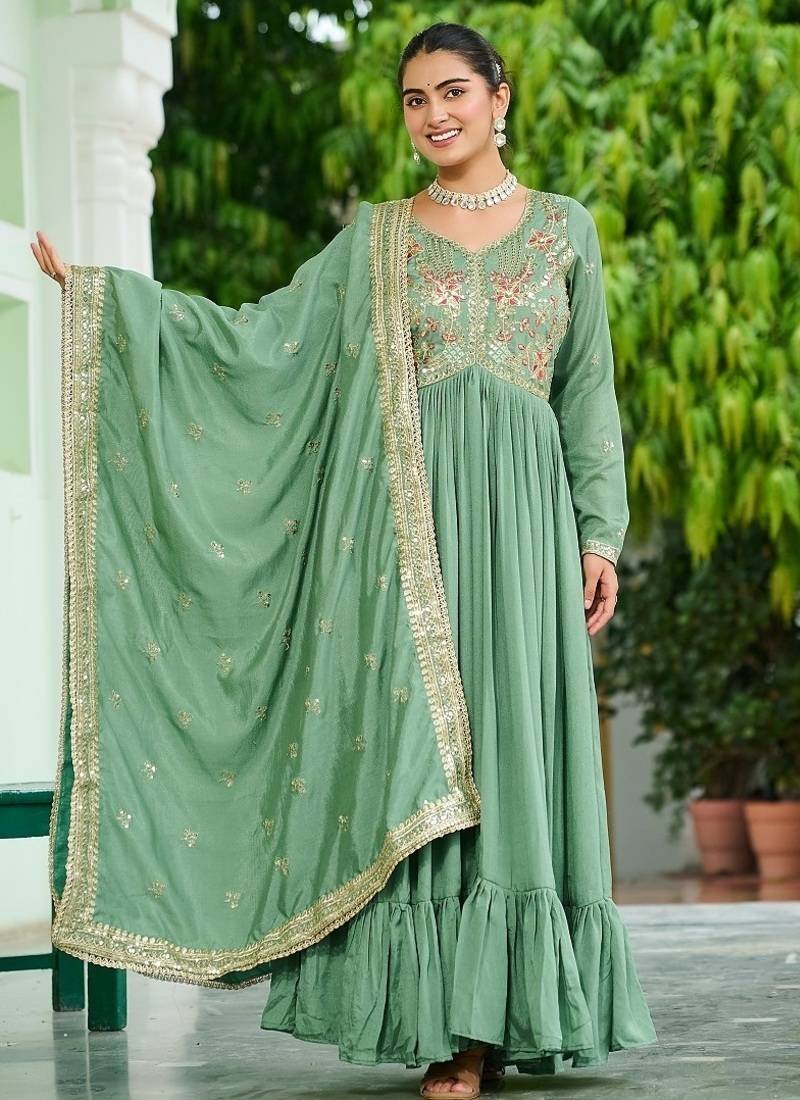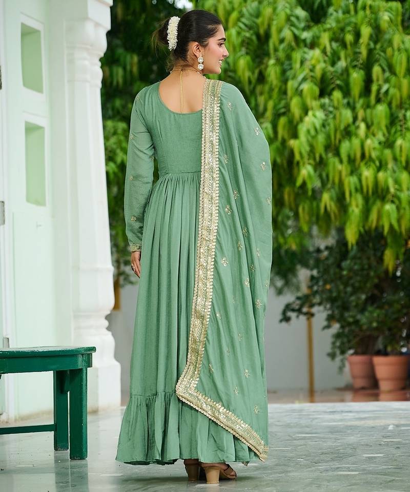 Light green color vichitra silk zari thread embroidered gown dupatta stitched