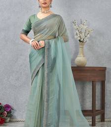 Light green color zirkon work border soft silk blend saree with blouse