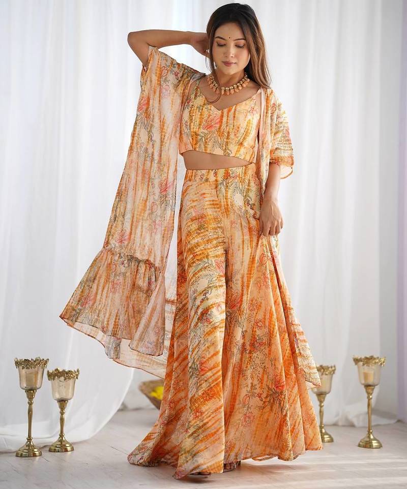 | Product Description | 3 Piece Set Of Indo Western Gathered Georgette Shrung With Fancy Blouse, Printed Plazzo Full Stitched Pure Soft Fox Georgette Floral Prints 44 Inch Shrug Length Pure Microscrape Full Lining Pure Fox Georgette Floral Print Palazzo Fully Sttiched Length 40 41 Inch Plazzo & Soft Fox Georgette Floral Print With Fully Sttiched Fancy Crop Top Blouse |