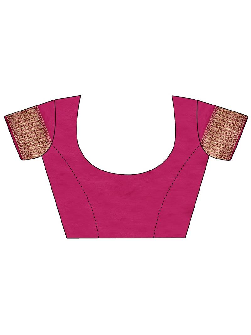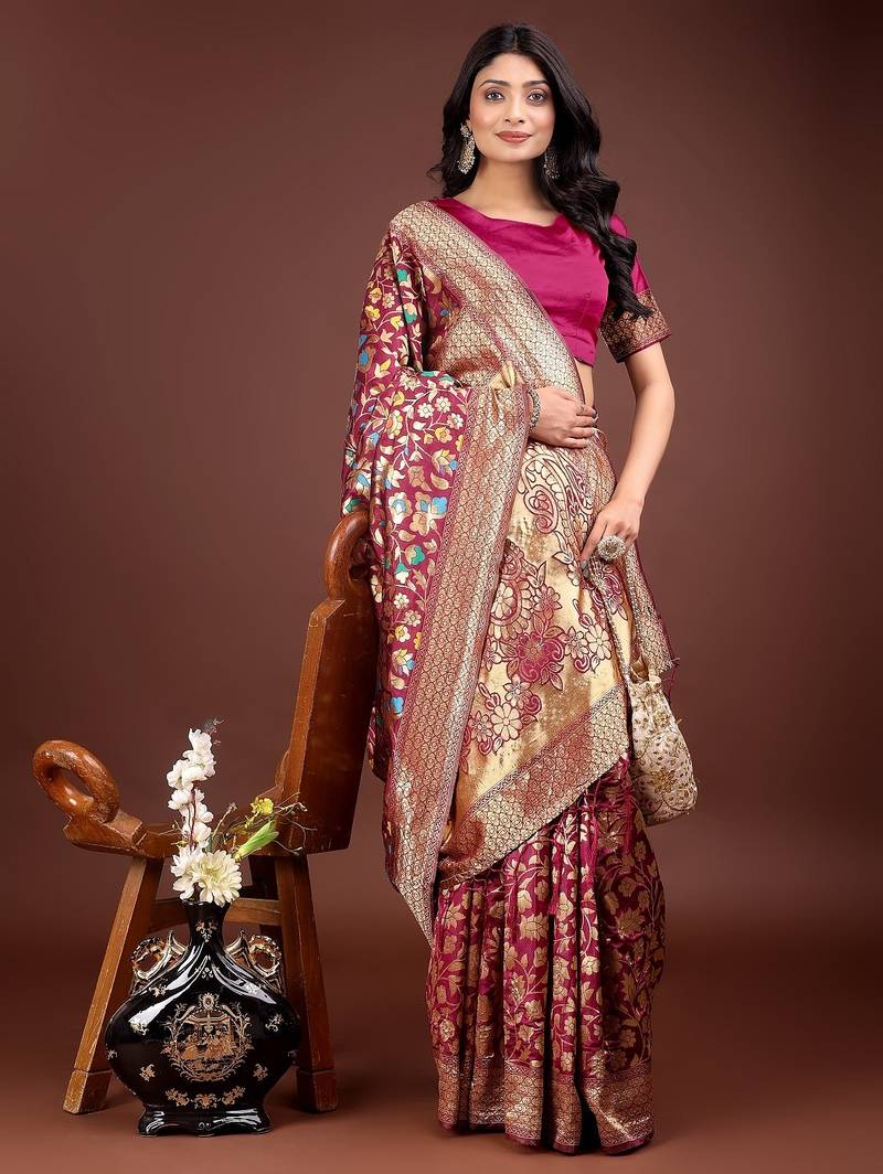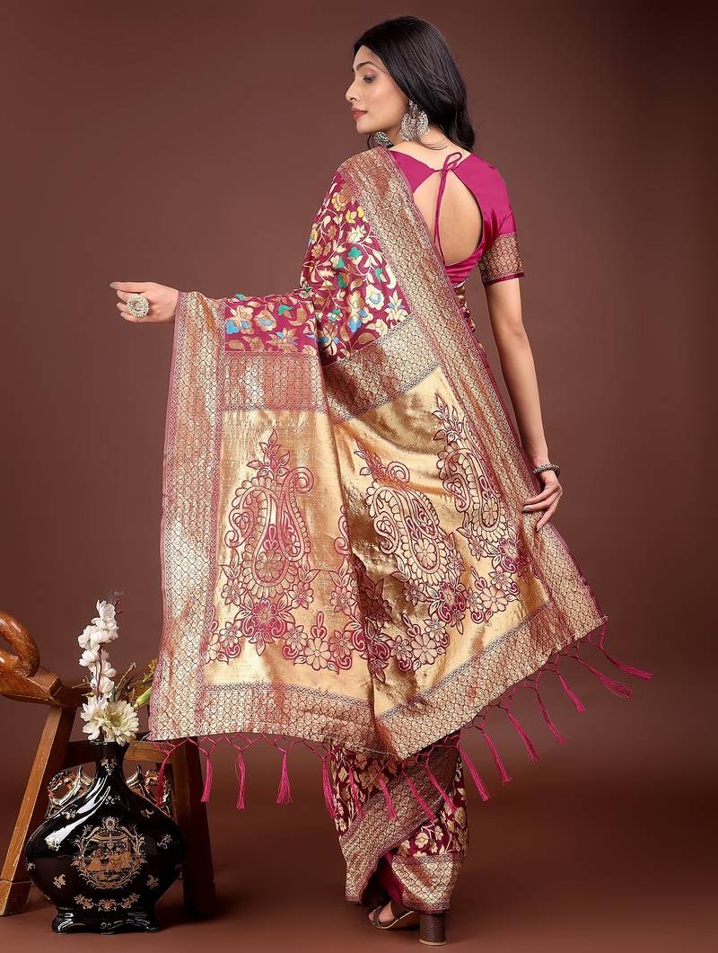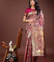 Magenta color lichi art silk blend woven work saree