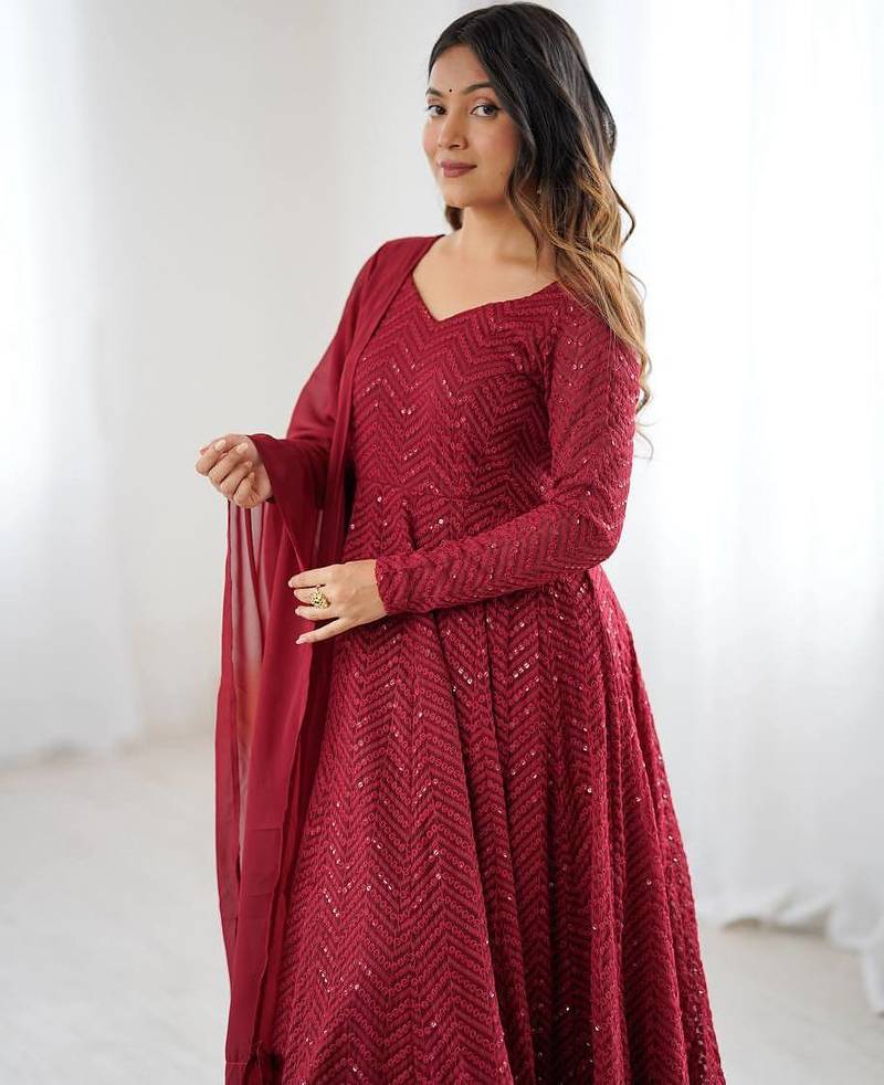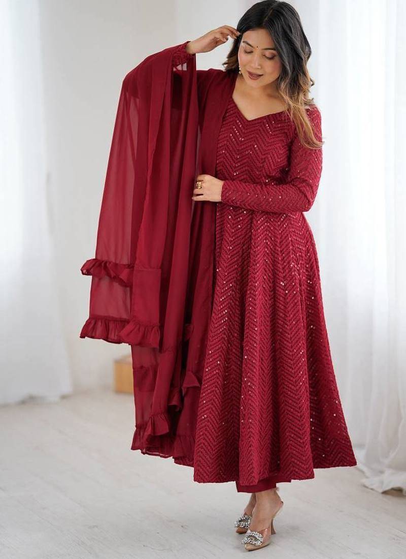 Maroon color lucknowi sequince thread work faux georgette anarkali set stitched