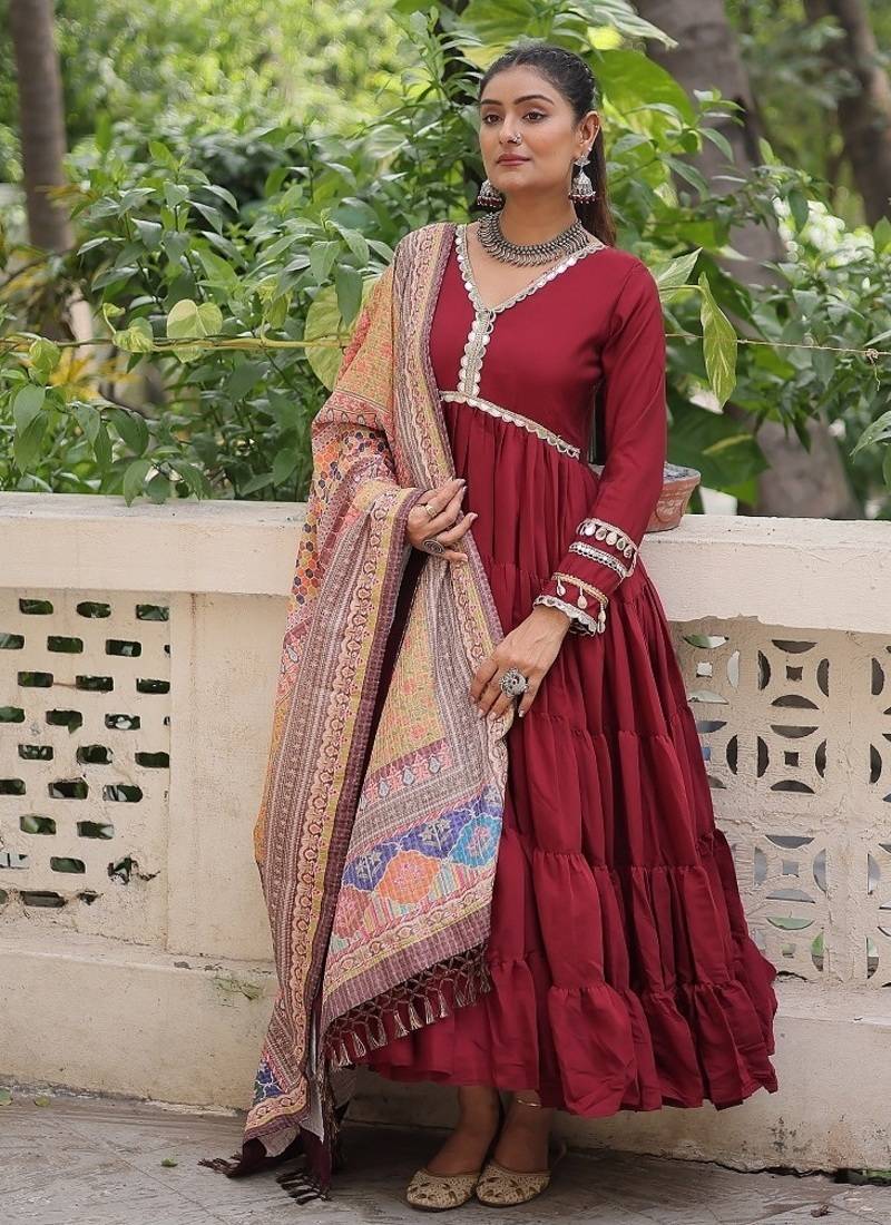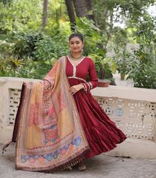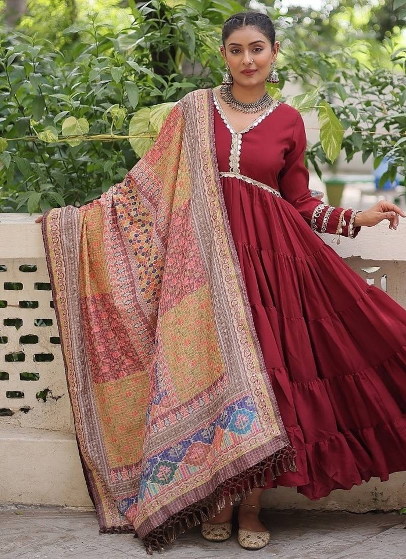 Maroon color roman silk mirror lace work gown with printed dupatta stitched