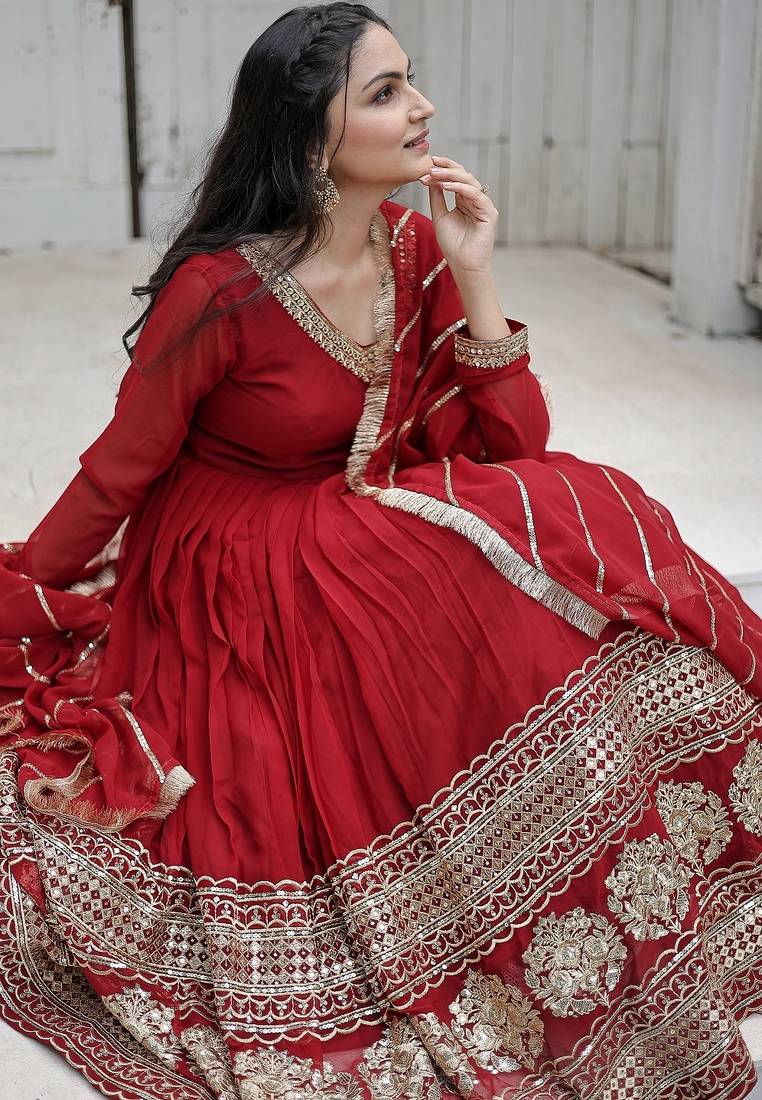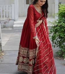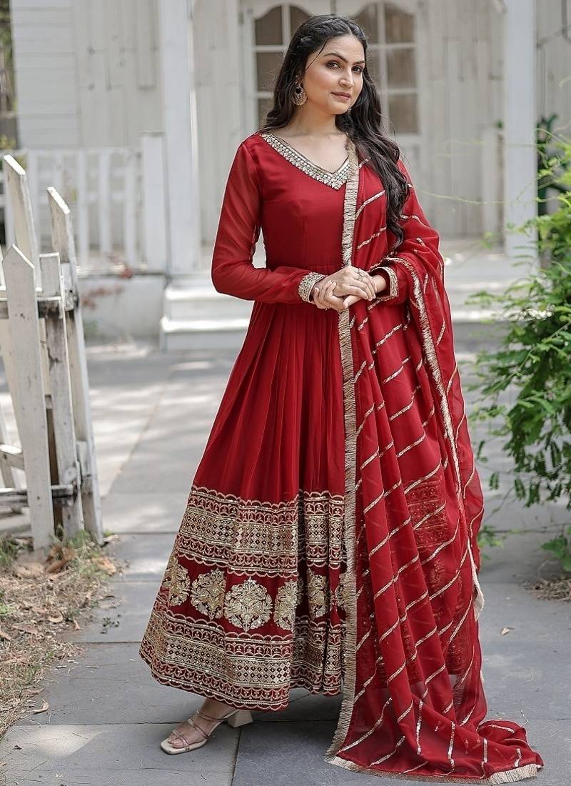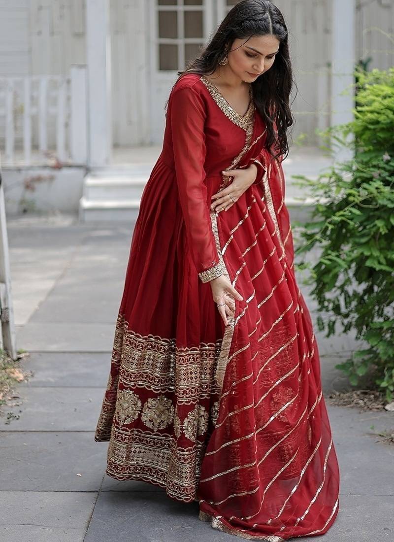 Maroon color sequins multi embroidered georgette gown with dupatta stitched