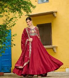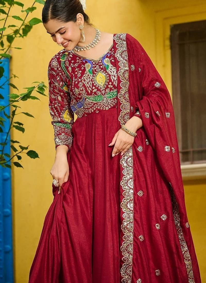 Maroon color thread embroidered work vichitra silk gown dupatta stitched