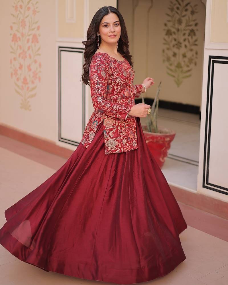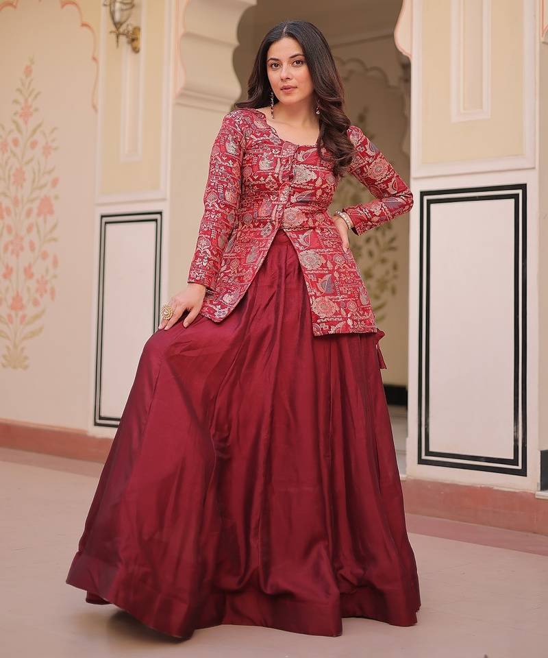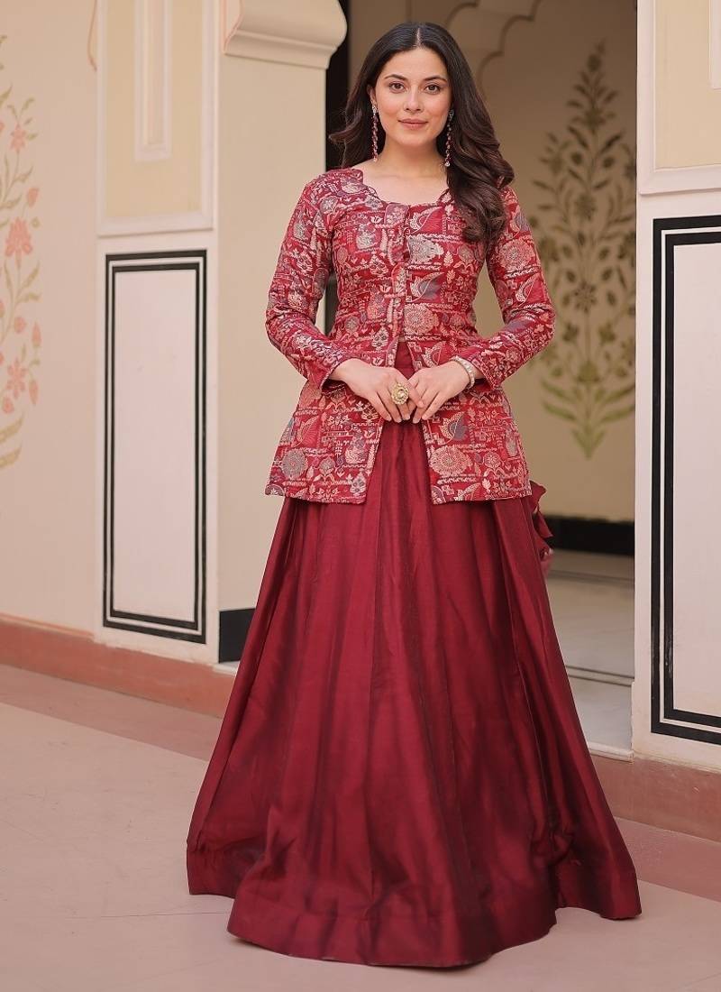 Maroon color vichitra silk solid lehenga jacquard blouse