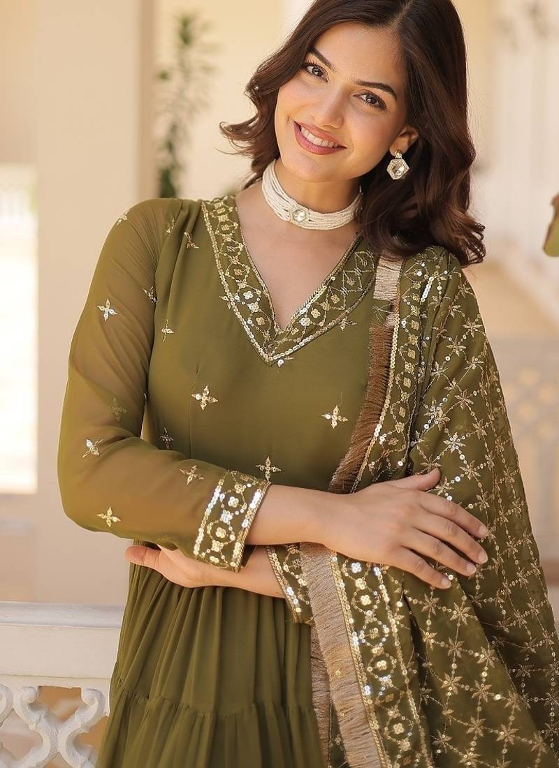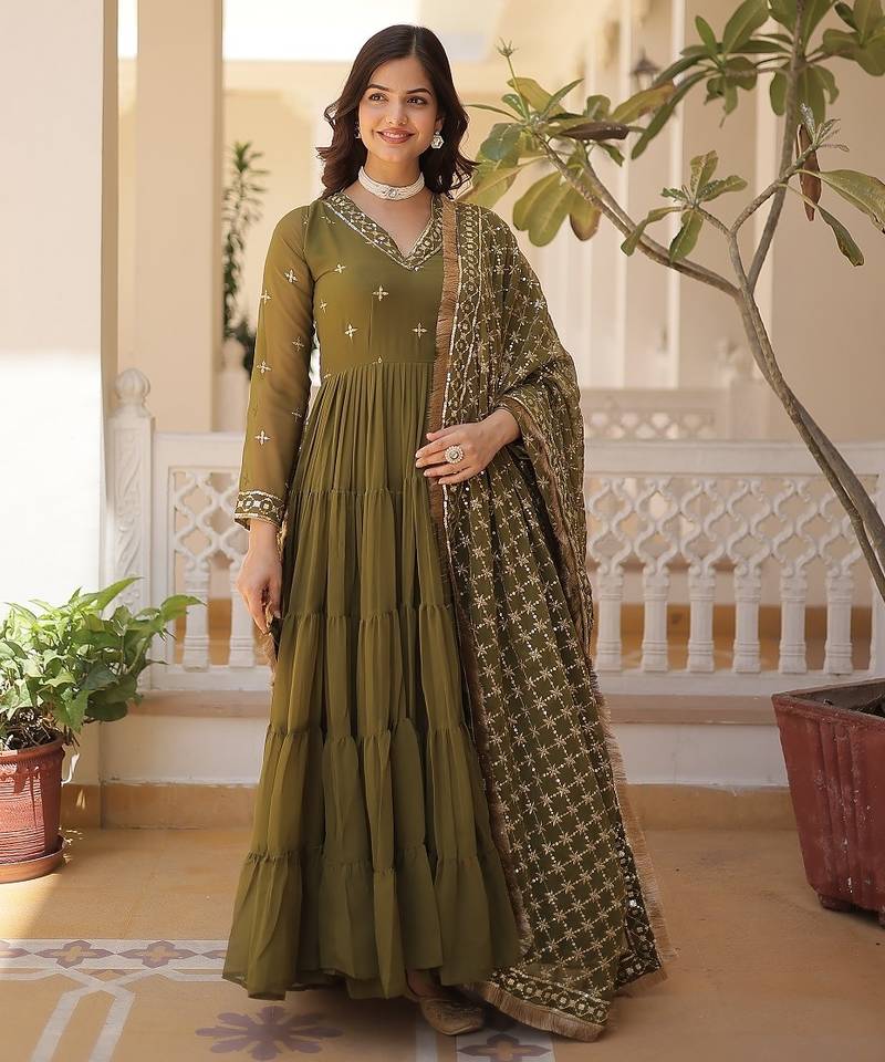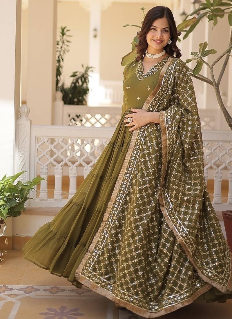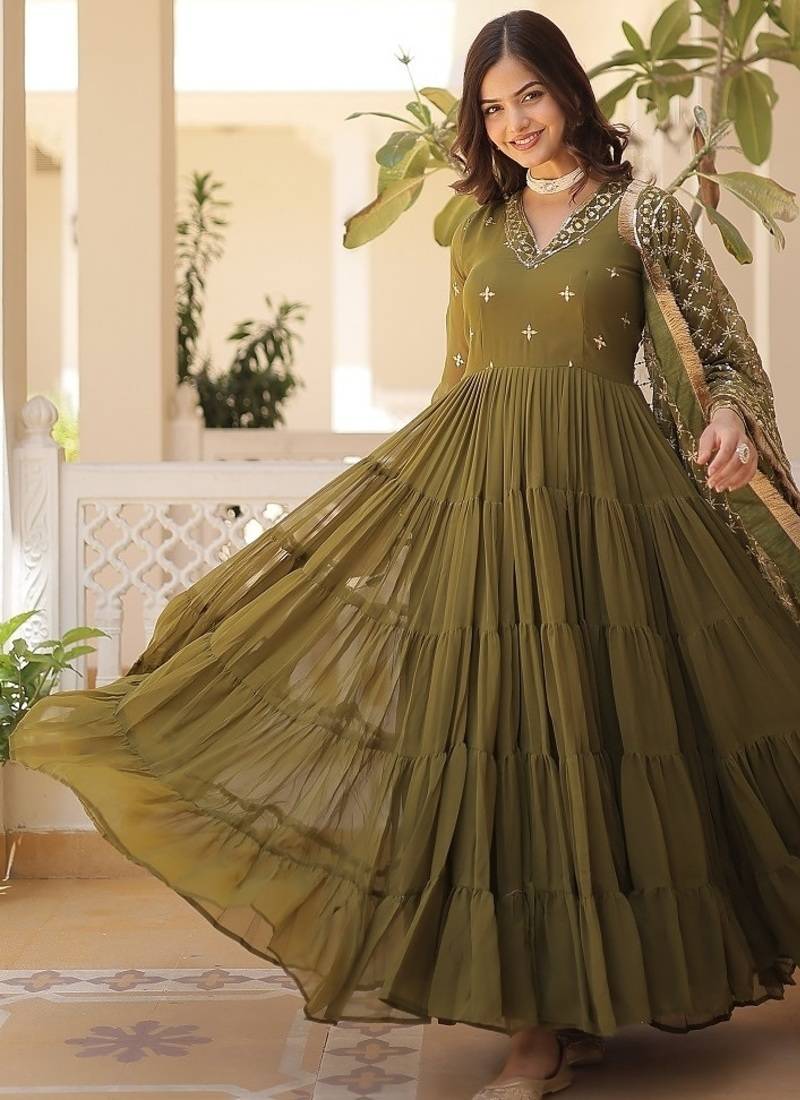 Mehandi green color embroidered work georgette gown with dupatta stitched