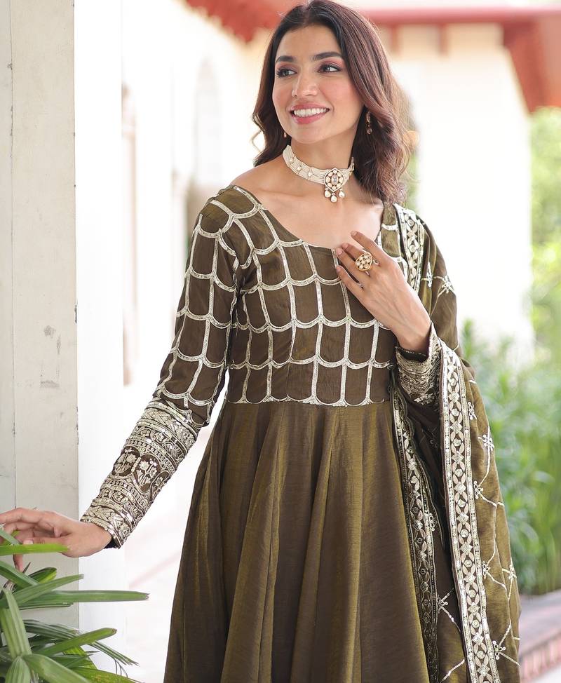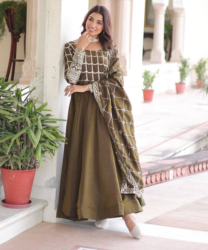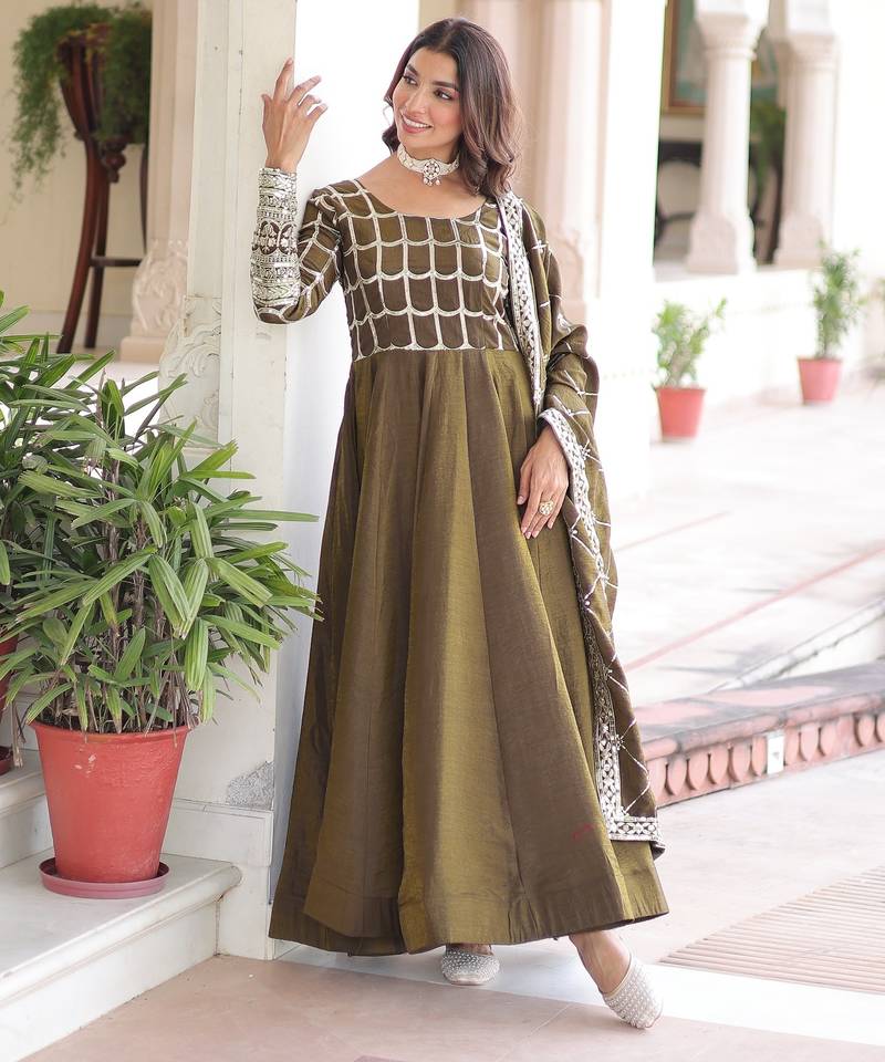 Mehandi green color zari sequins embroidered work vichitra silk gown dupatta stitched
