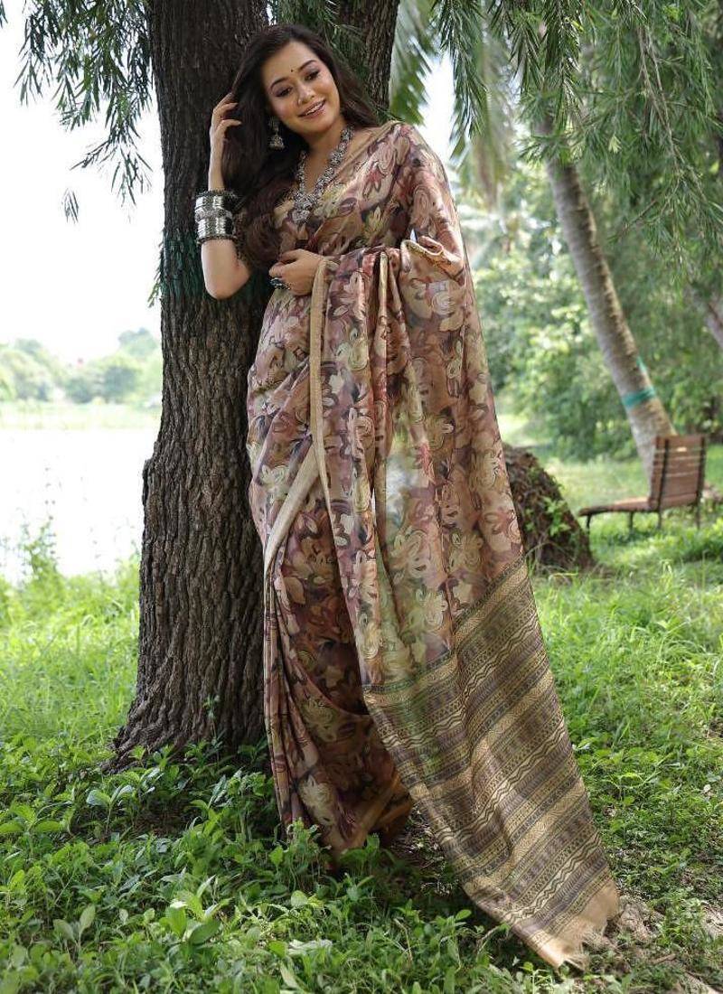 | Product Description | Soft Desi Tussar Silk Saree With Unique Hand Type Printed Pattern With Tiny Zari Weaving Border And Printed Pallu With Traditional Tassels And Running Blouse Piece |