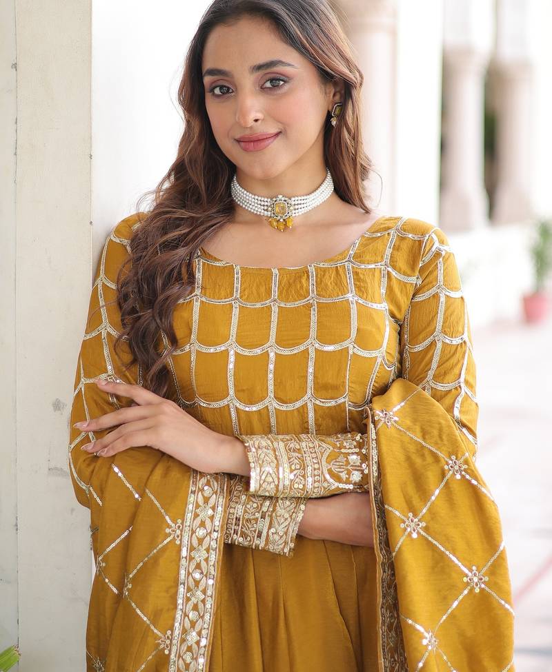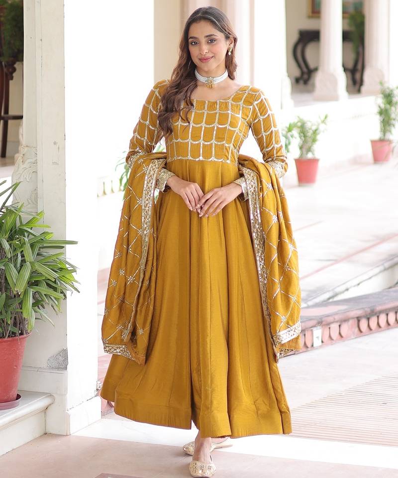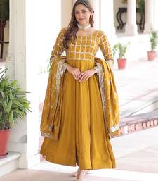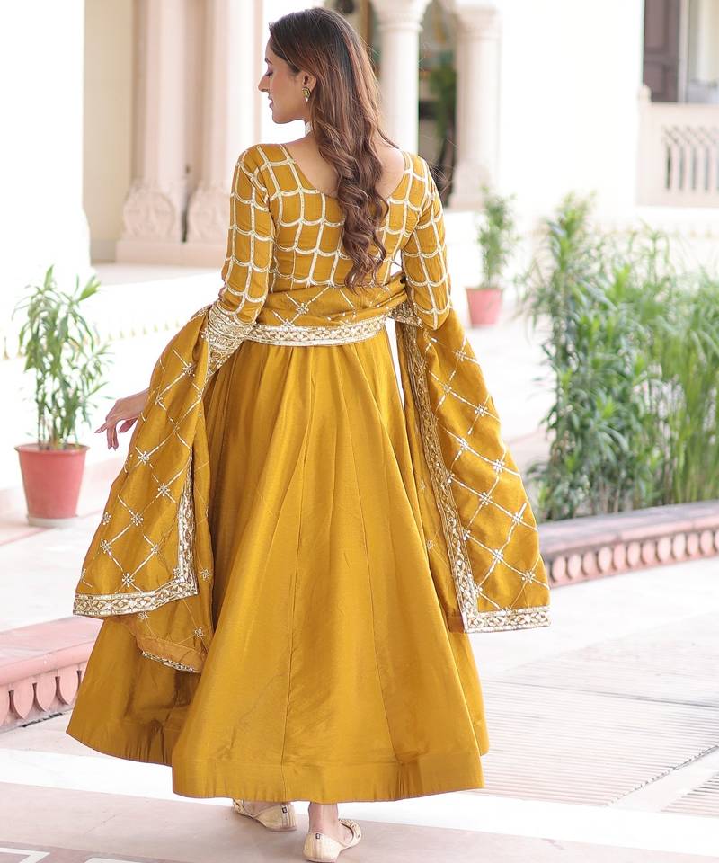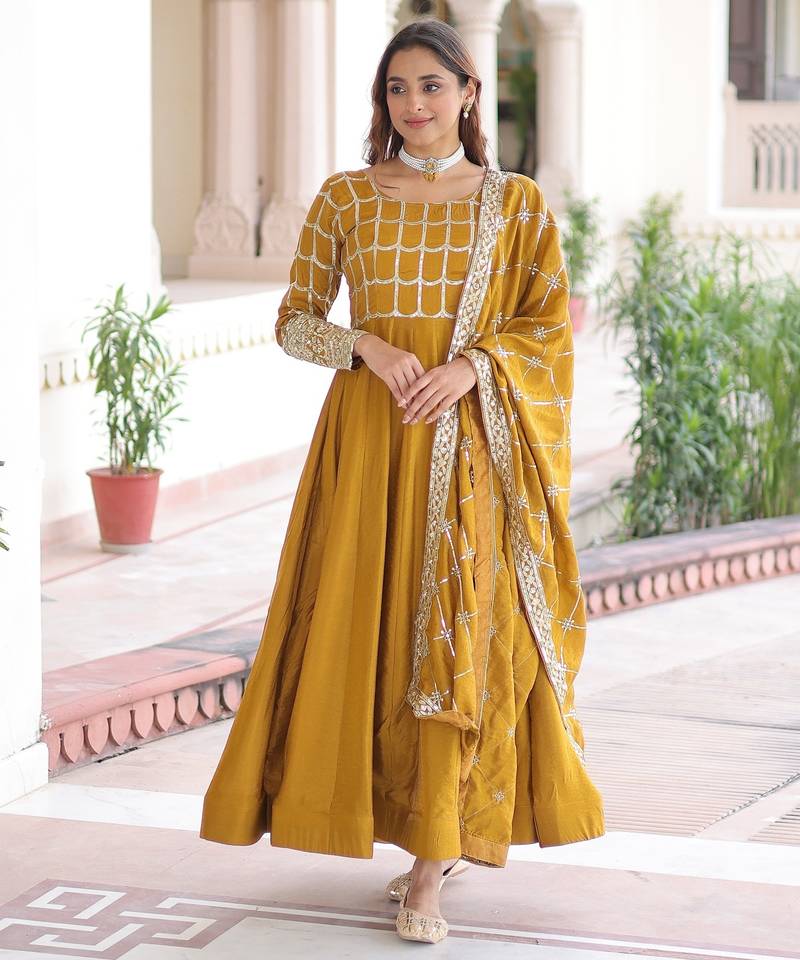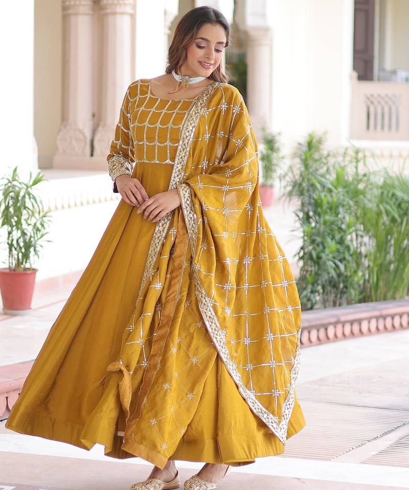 Musturd color zari sequins embroidered work vichitra silk gown dupatta stitched