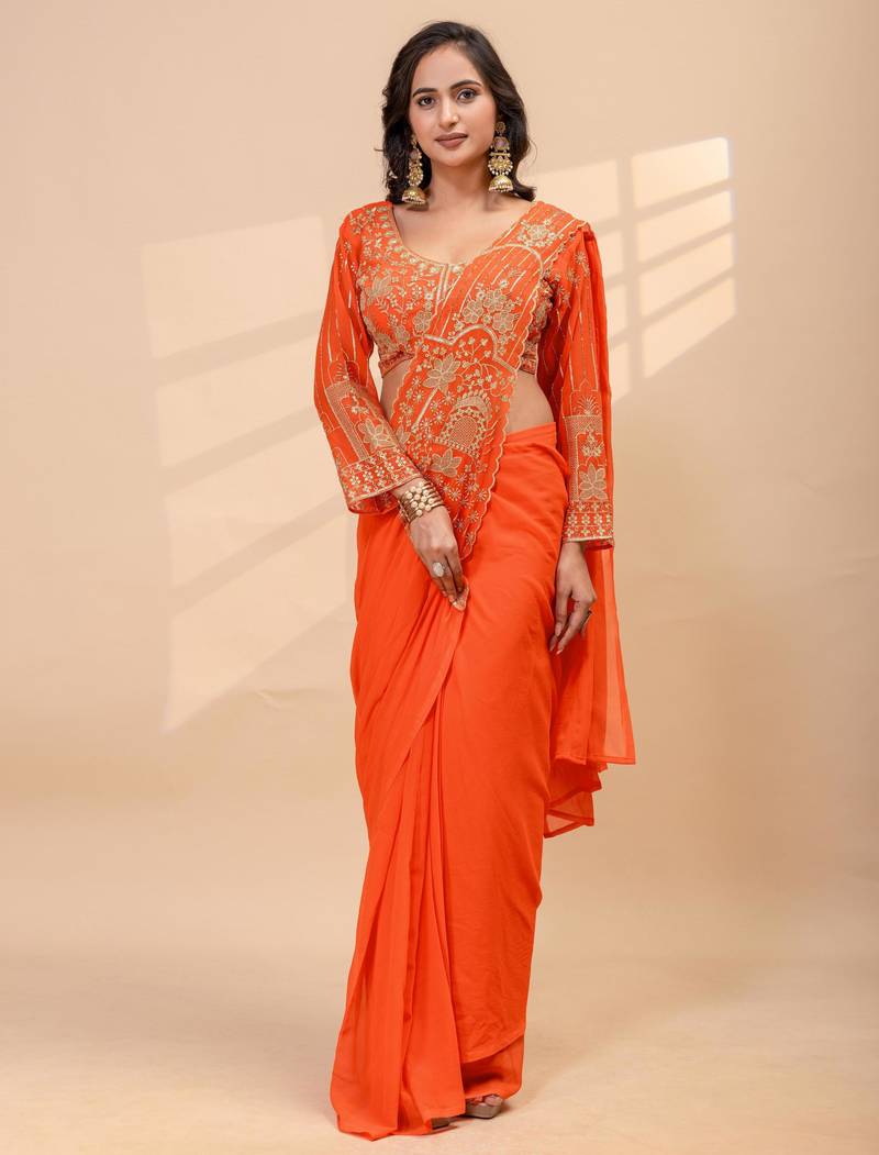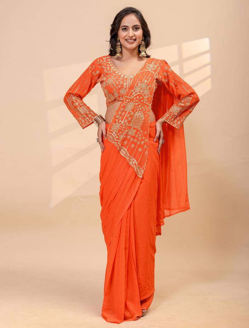 Orange color thread semi beads embroidered work ready to wear saree with full-stitched free size blouse