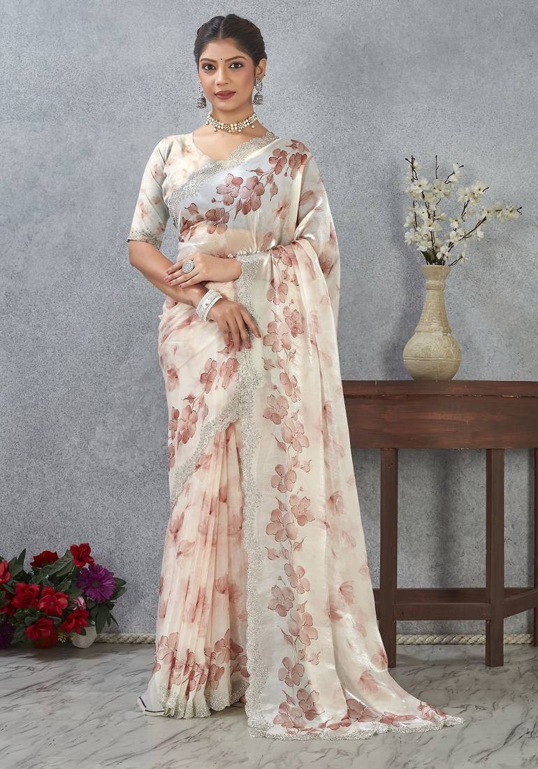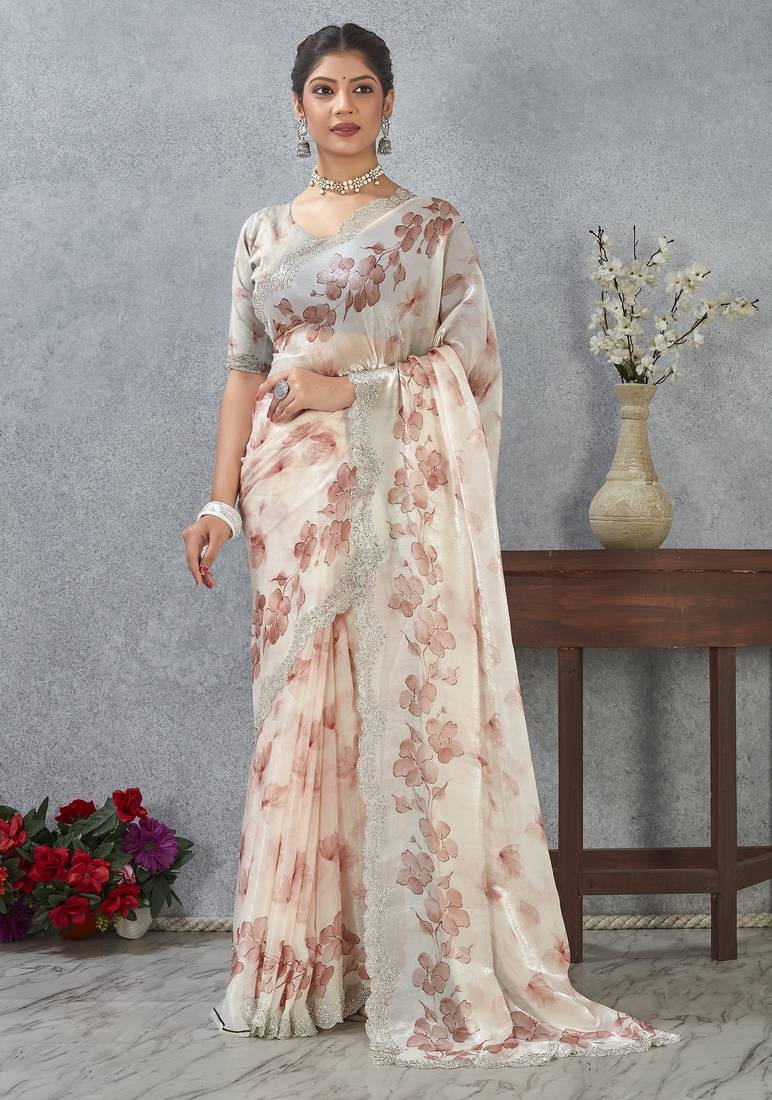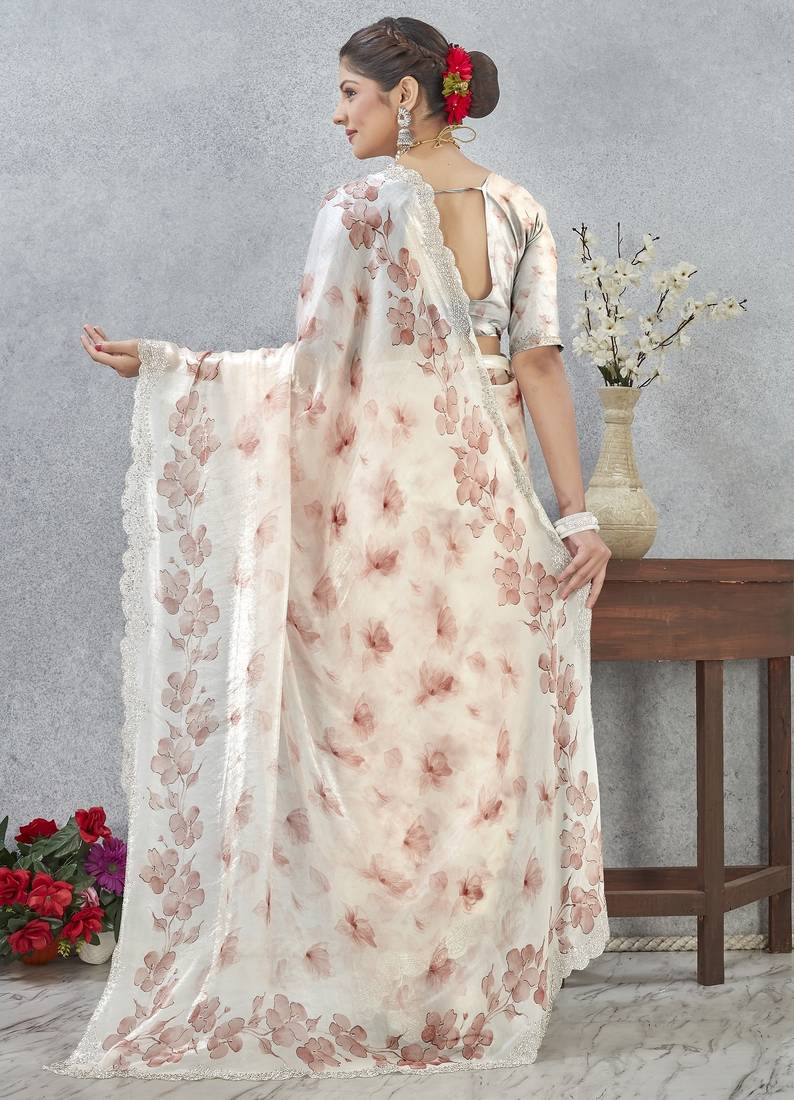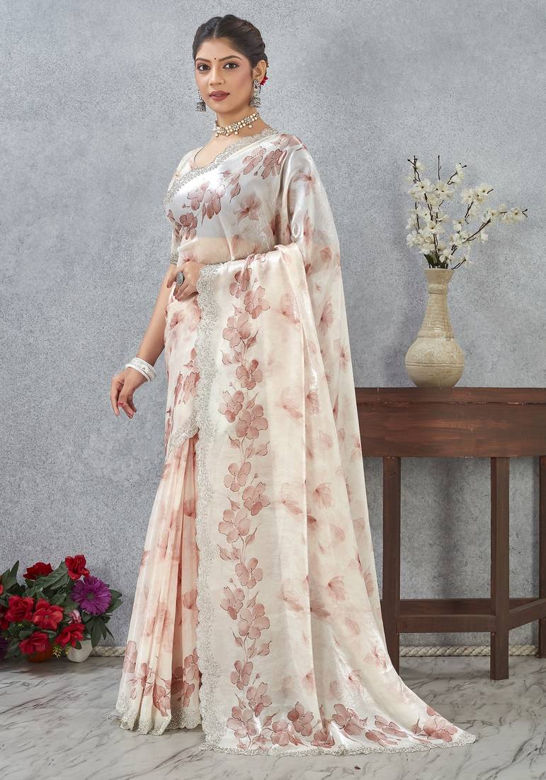 Peach color zirkon work border fendy satin digital print saree with blouse
