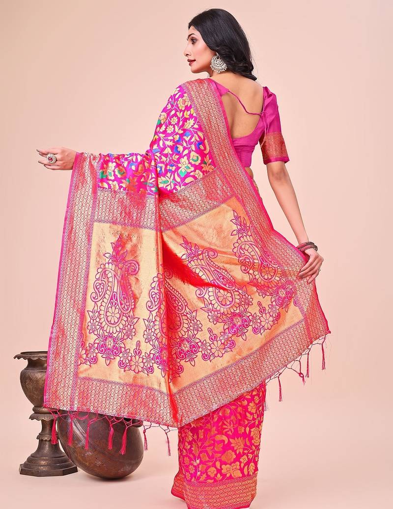 Pink color lichi art silk blend woven work saree