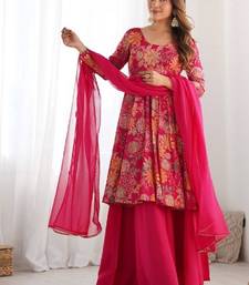 Pink color romansilk chanderi discharge print kediya style top plazzo dupatta. stitched