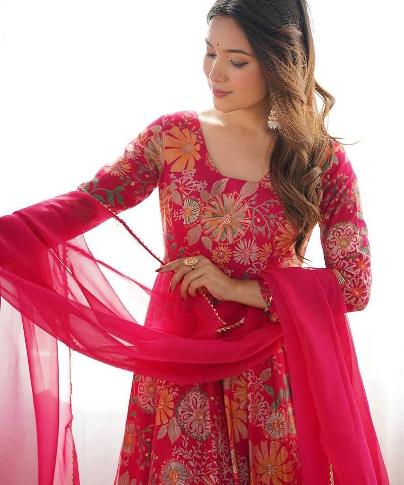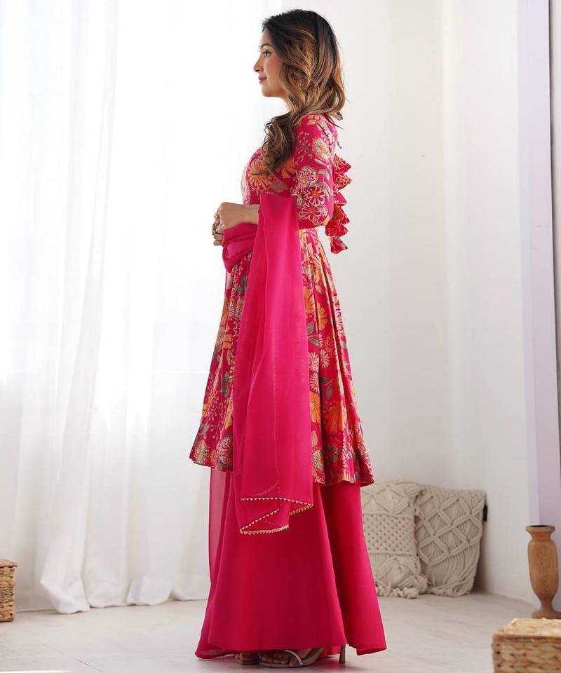 | Product Name | Pink Color Romansilk Chanderi Discharge Print Kediya Style Top Plazzo Dupatta. | |