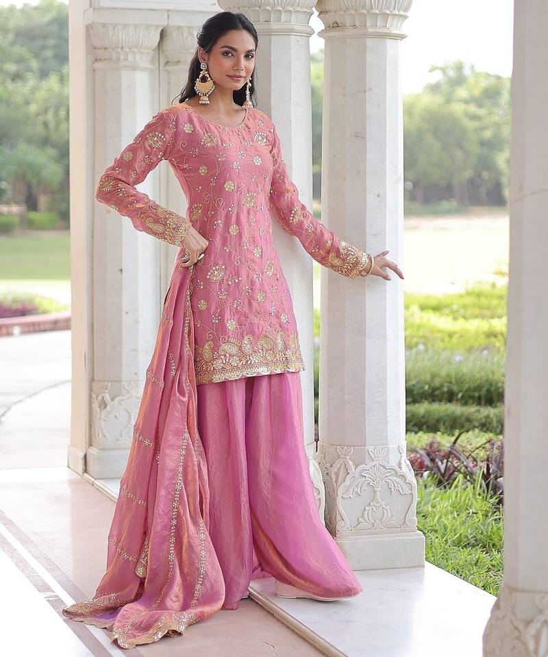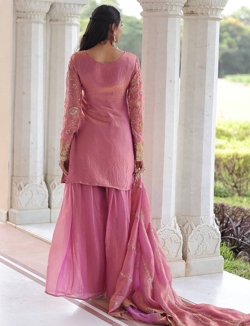 Pink color sequins work fendi silk designer readymade top-sharara-dupatta stitched