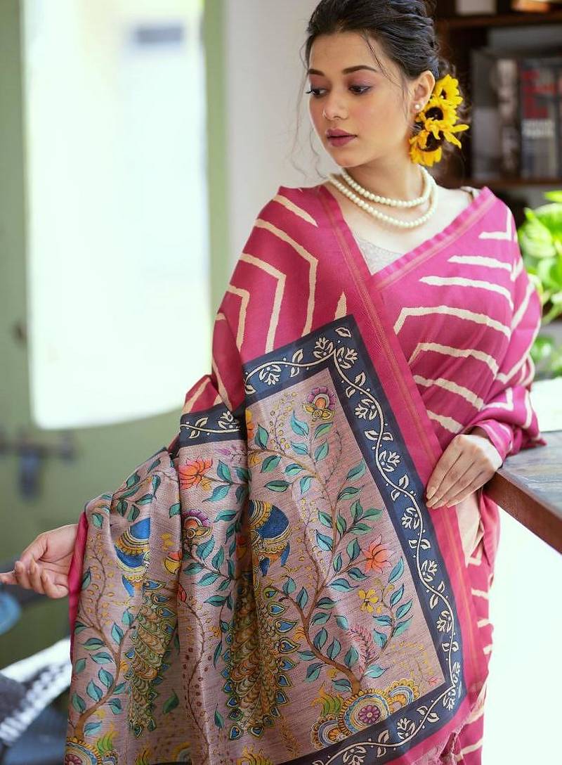 | Product Description | Tussar Silk Saree With Beautiful Leriya Print And Finished Zari Border With Kalamkari Pallu And Tassels |