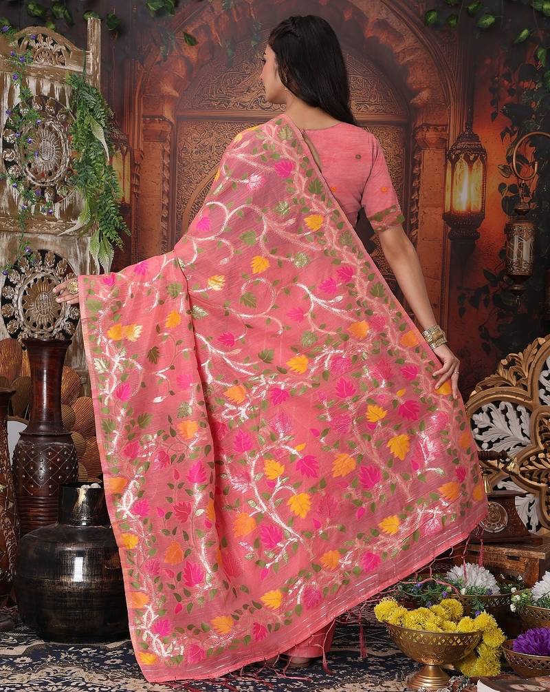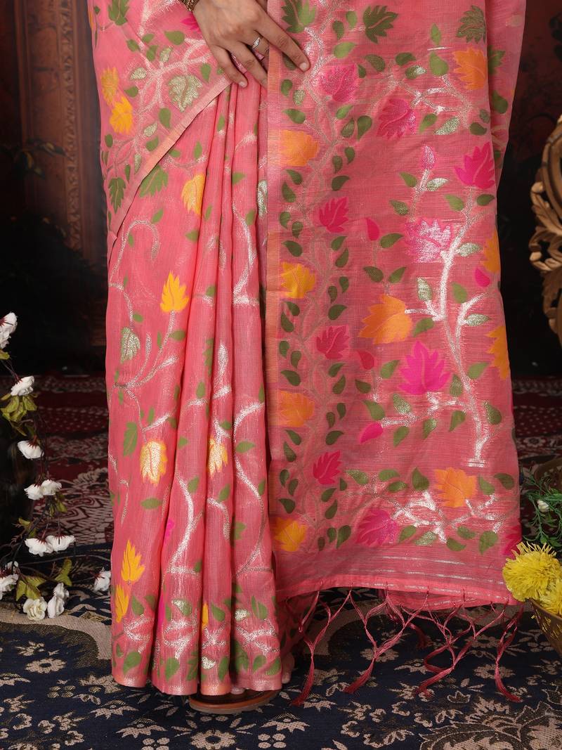 | Product Name | Pink Color Weaven Flower Linen Cotton Saree | |