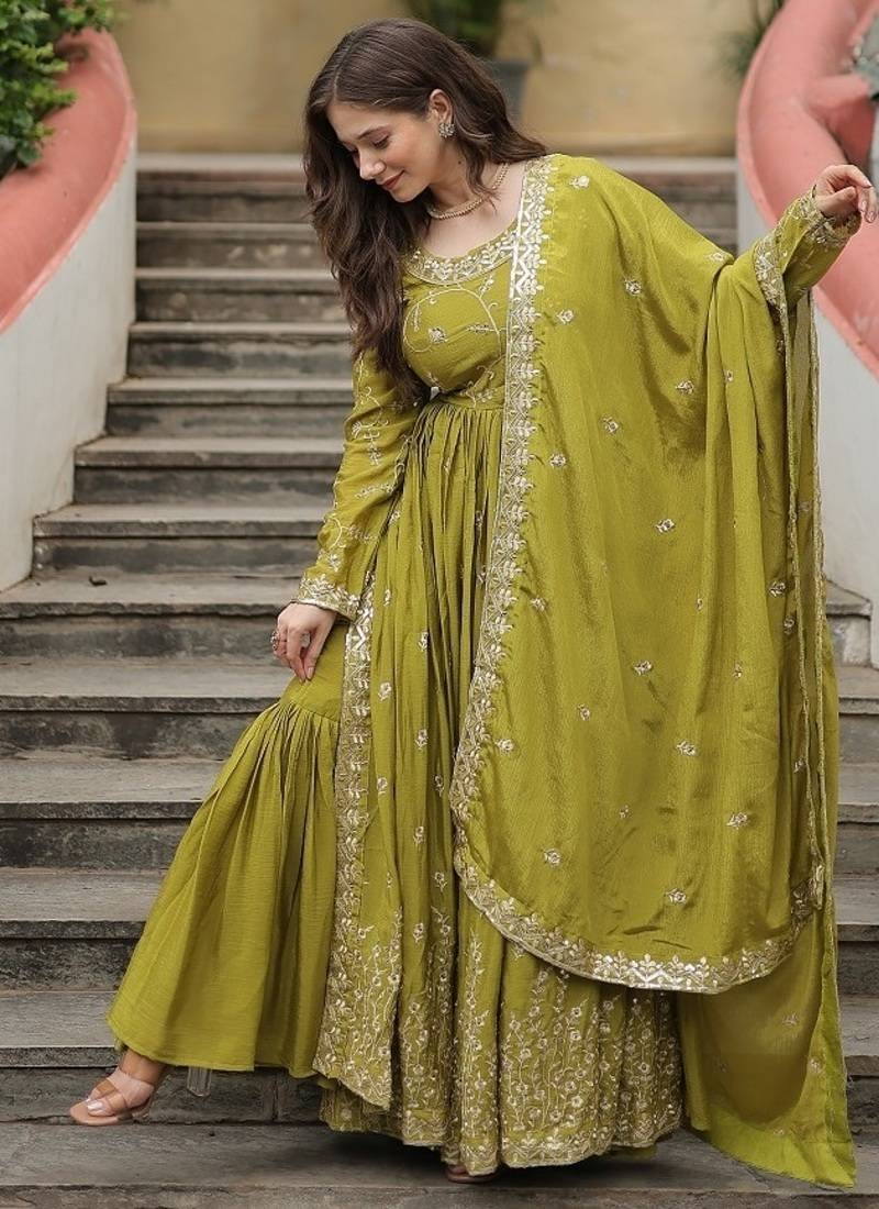 Pista green color sequins embroidered chinnon gown sharara with dupatta stitched