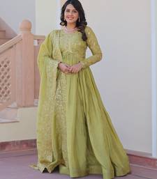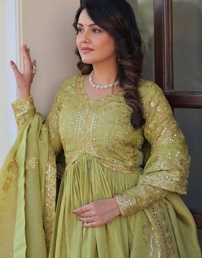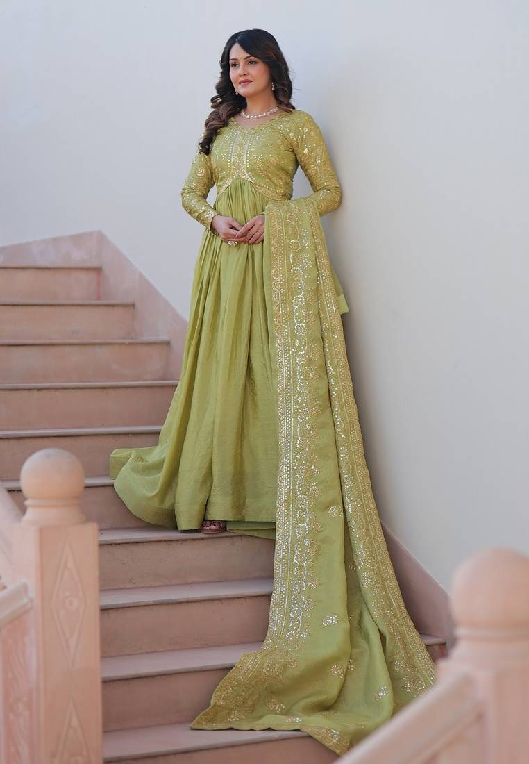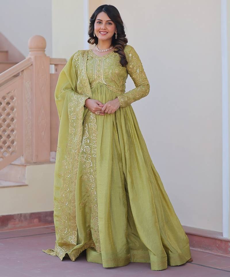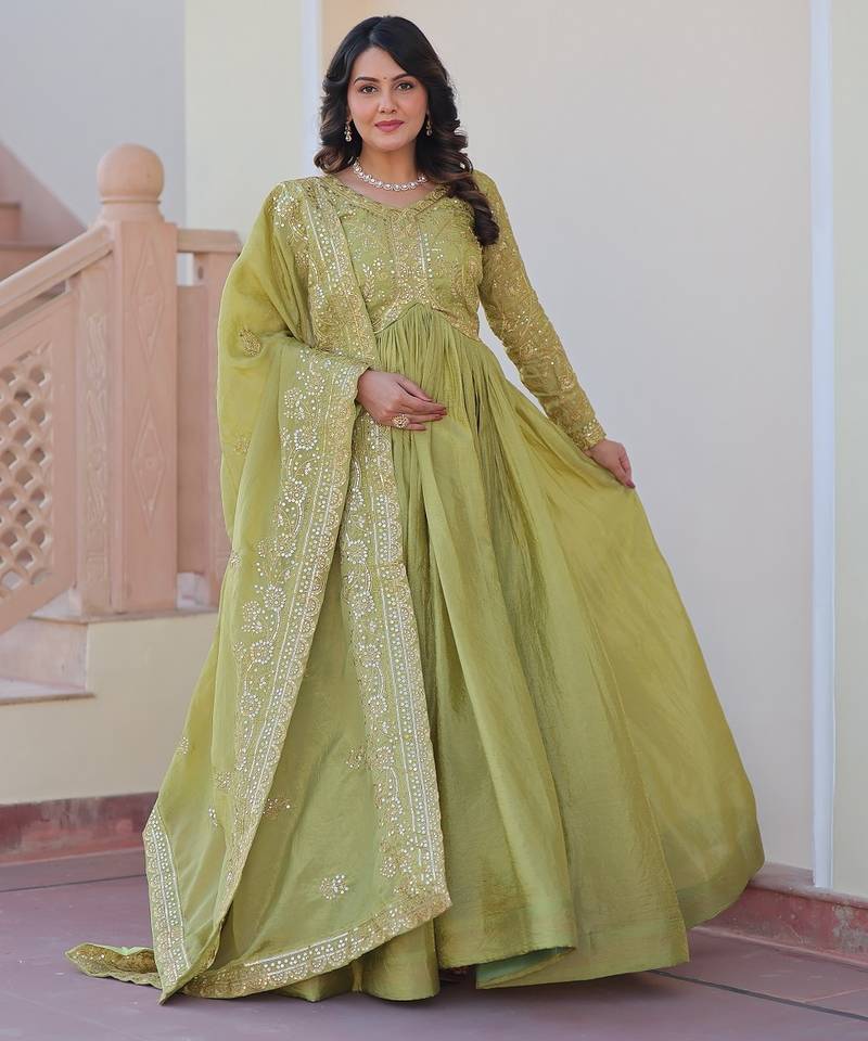 Pista green color sequins multi embroidered work gold crush gown dupatta stitched