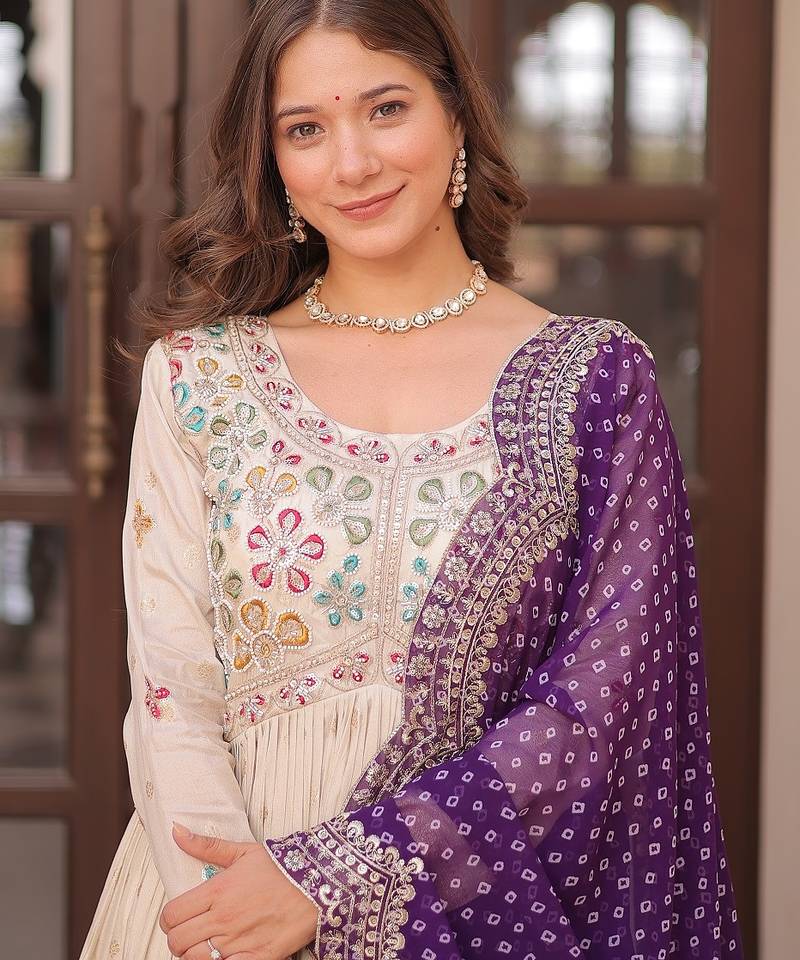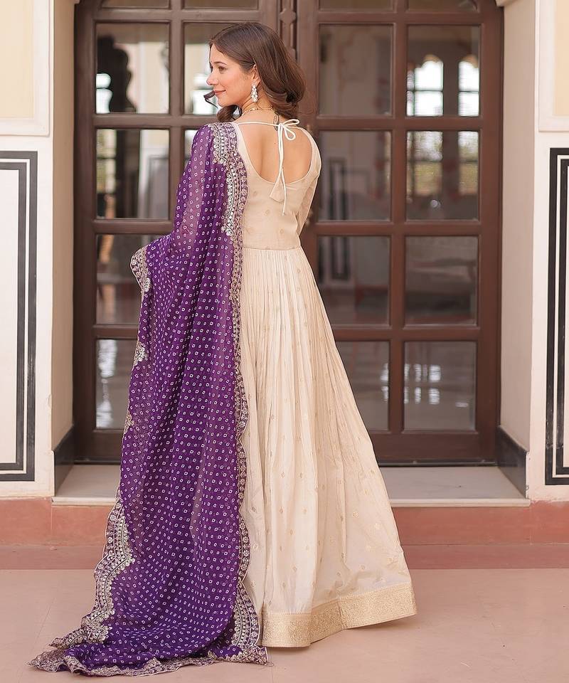 | Product Description | Experience The Allure Of Trending Cosmos Jequard Gown With Bandhani Printed Embroidered Cut Work Dupatta. Discover The Perfect Fusion Of Elegance And Grace. Shop Now For A Timeless Appearance.3 Mtr Flair Stitched With Canvas With Georgette With Bandhani Print With Embroidered Cut Work Dupatta. |