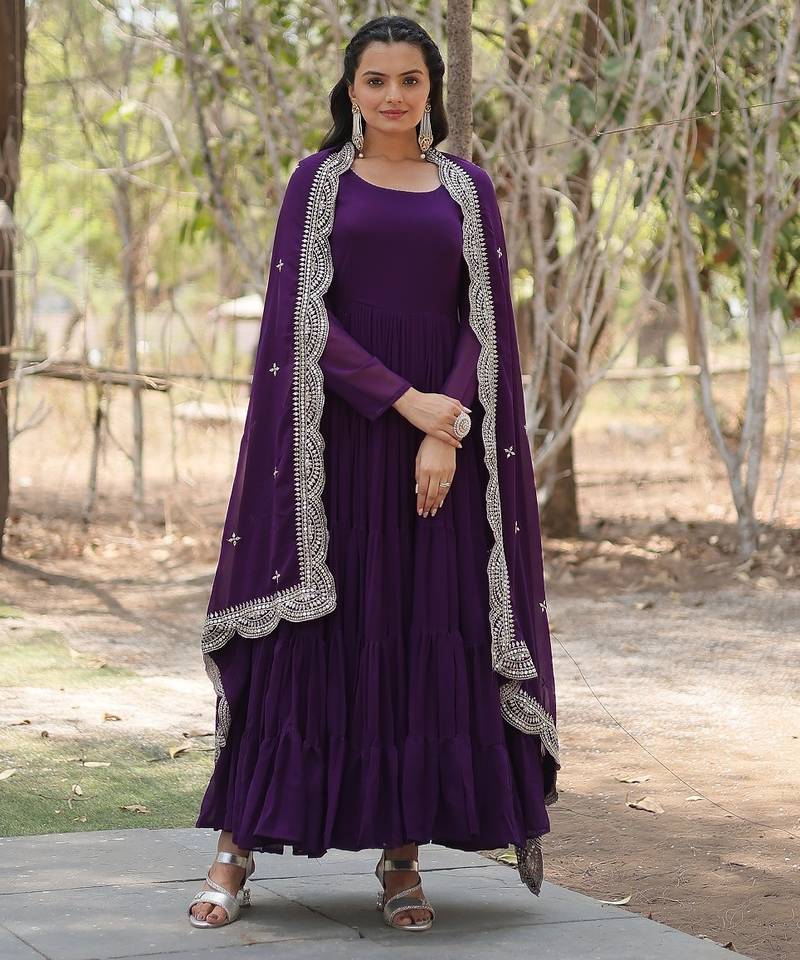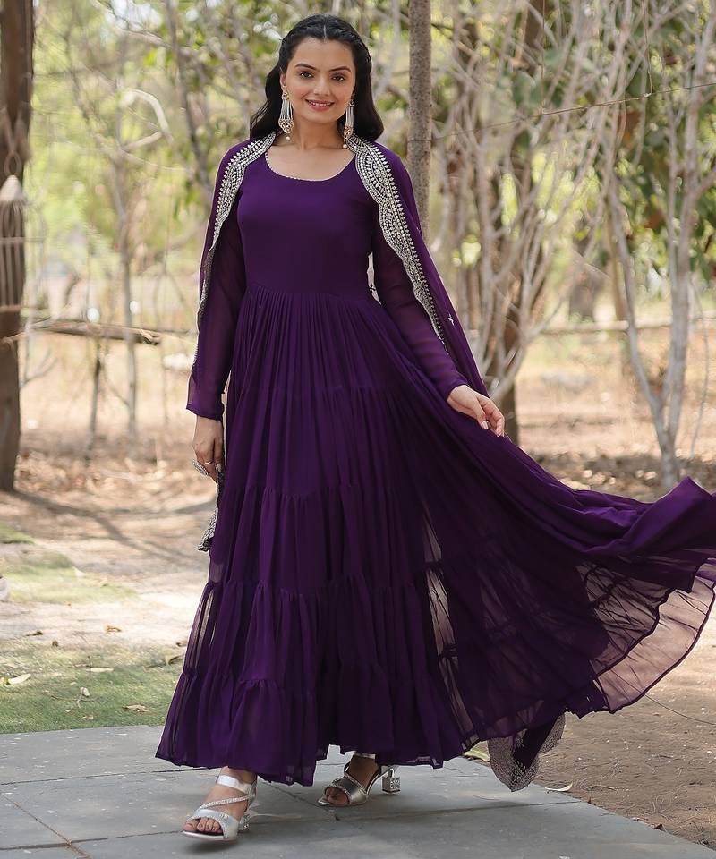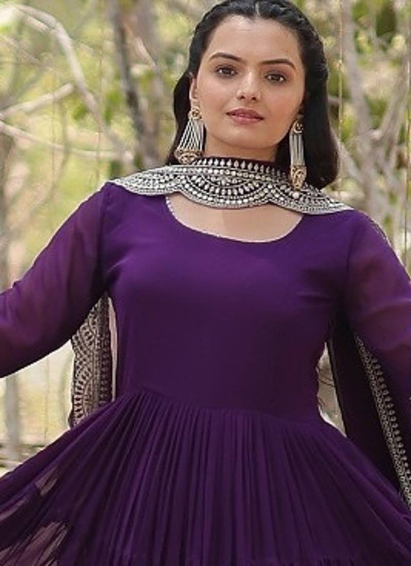 Purple color embroidered georgette gown with dupatta stitched