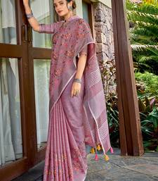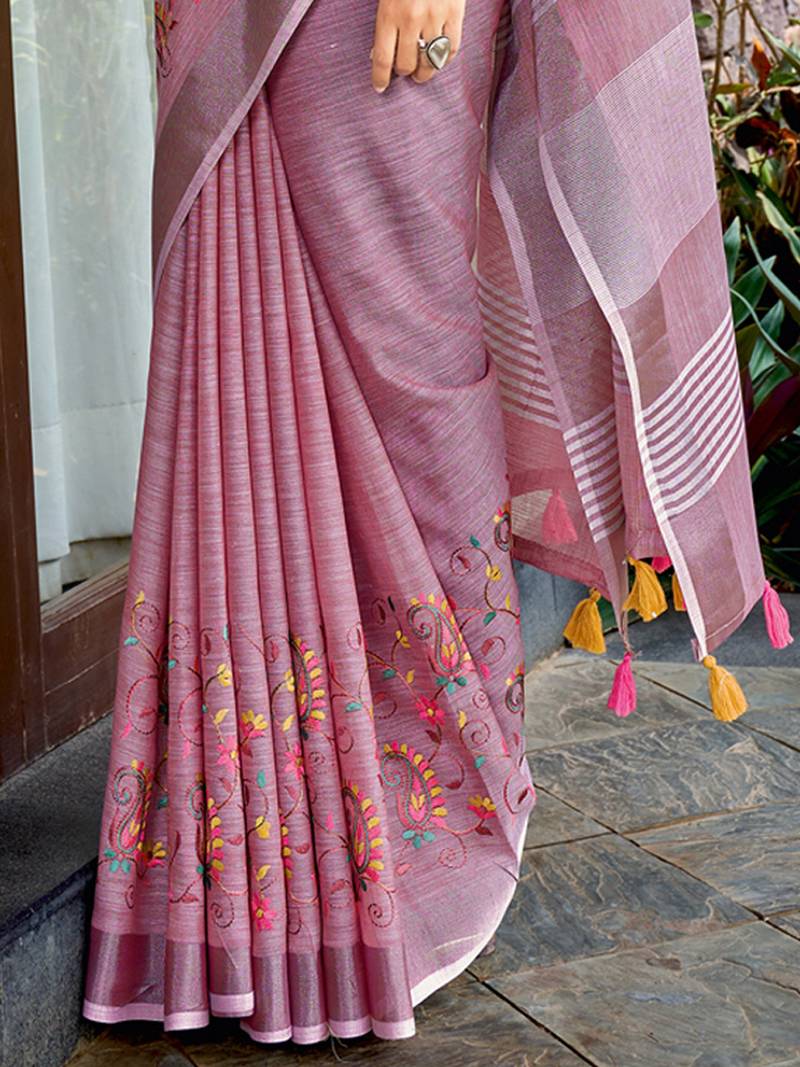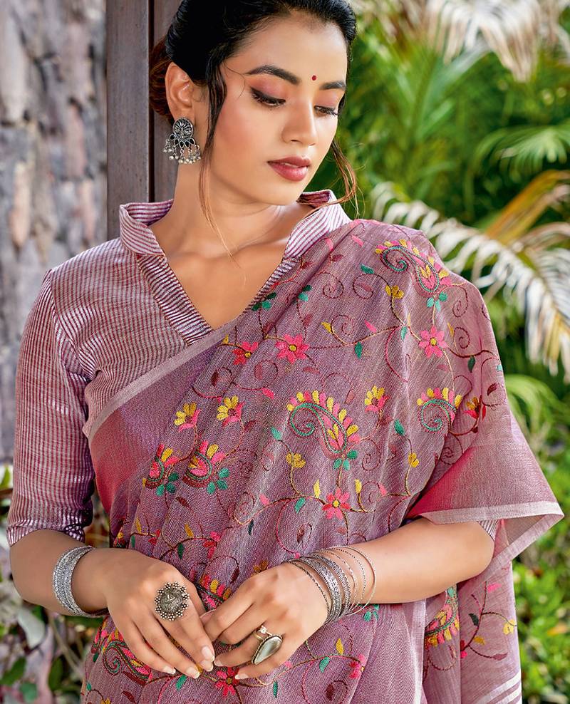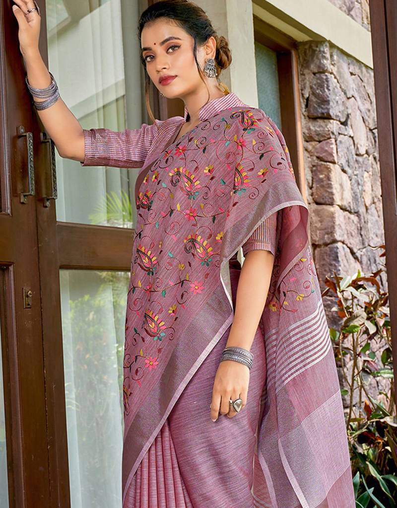 | Product Name | Purple Color Embroidered & Zari Border Linen Saree With Blouse | |