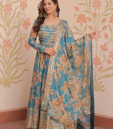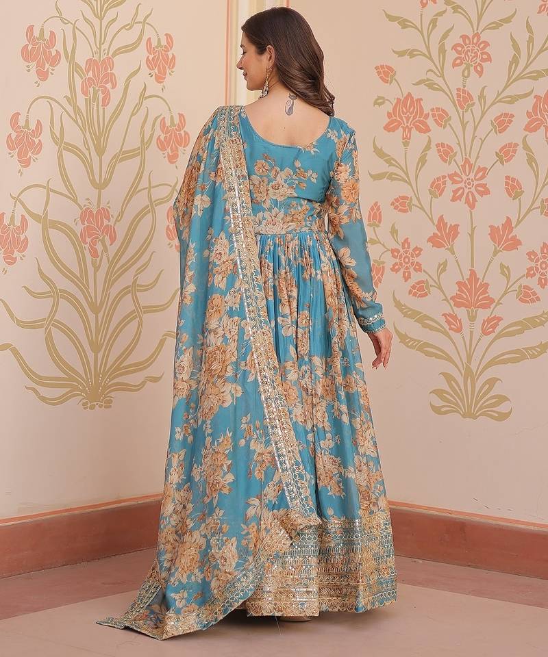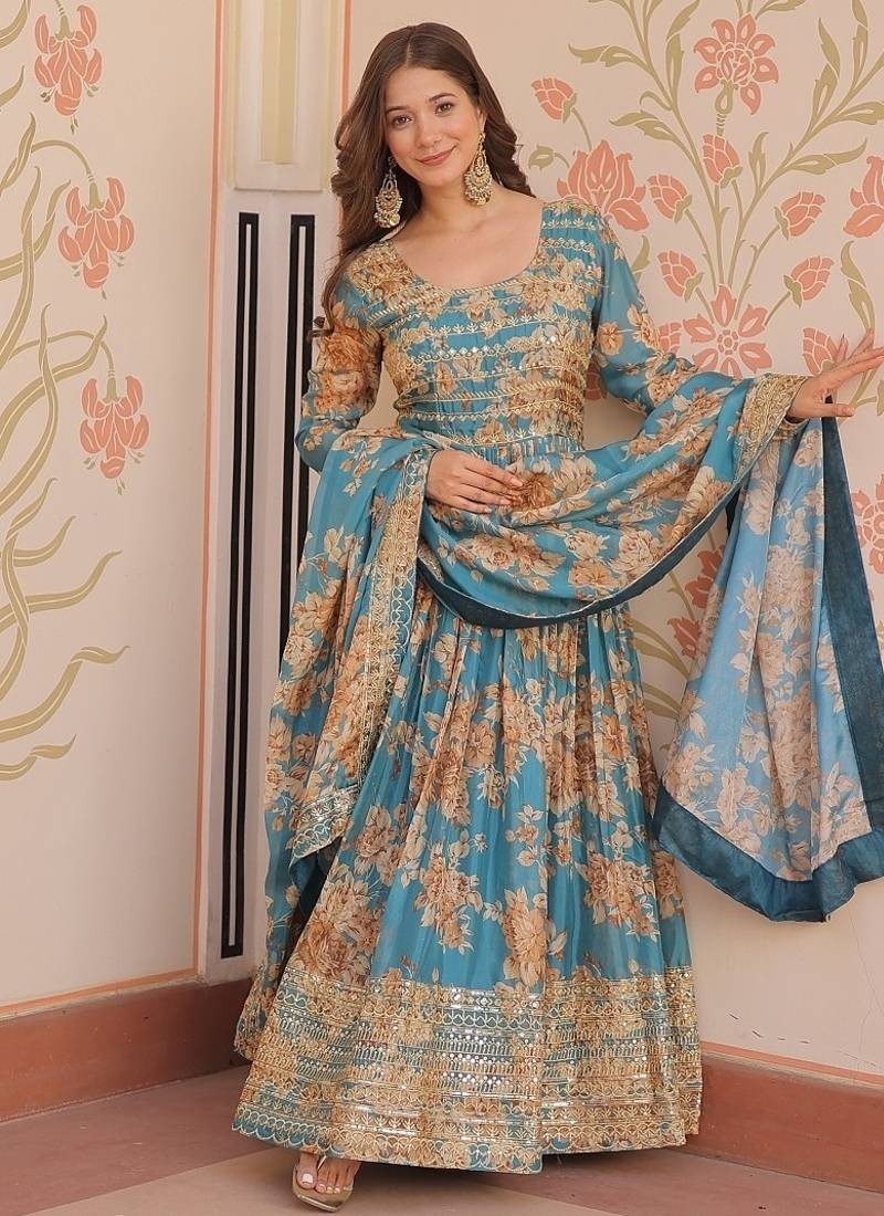 Rama blue color digital printed with sequins work russian silk gown dupatta stitched