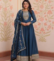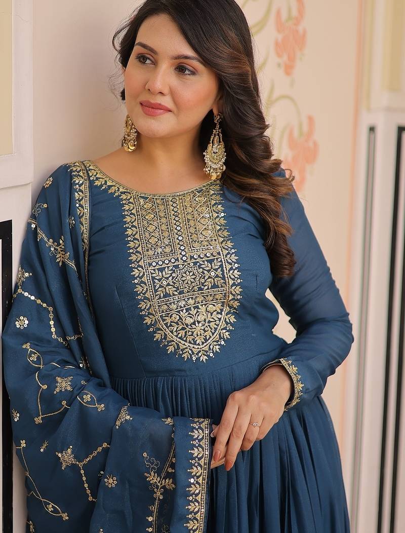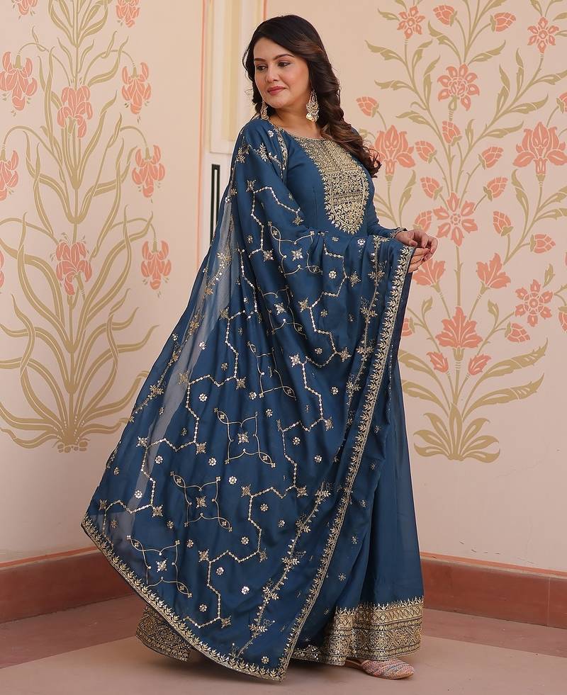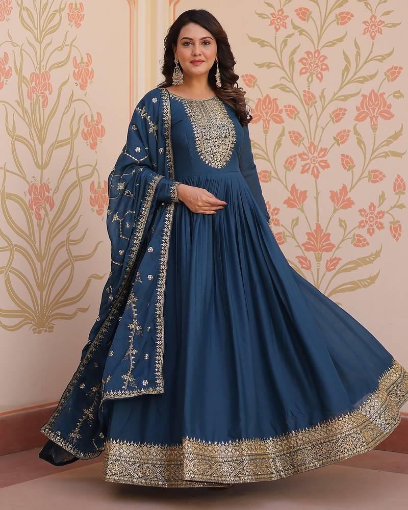 Rama blue color zari sequins embroidered work georgette gown stitched