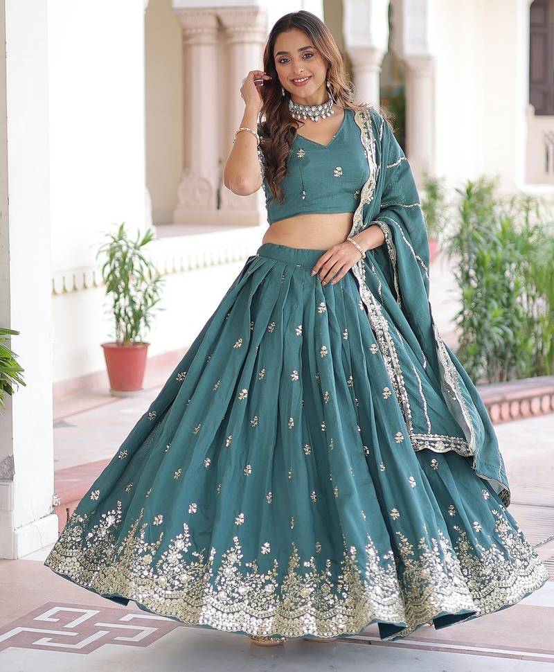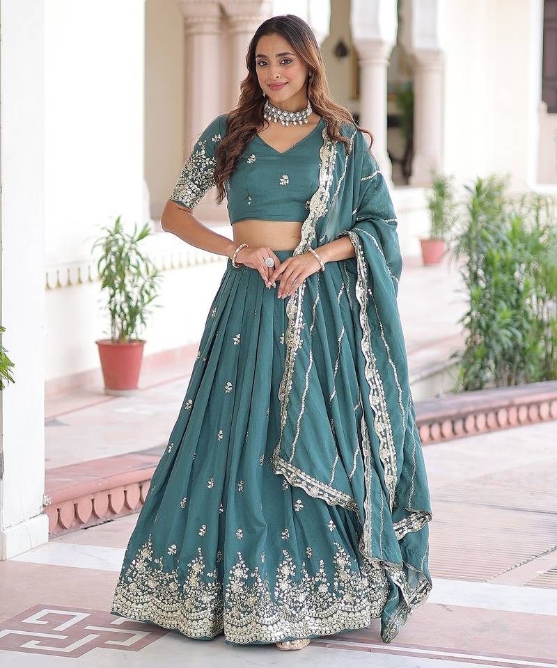 Rama color vichitra silk sequins zari multi embroidered lehenga choli with dupatta