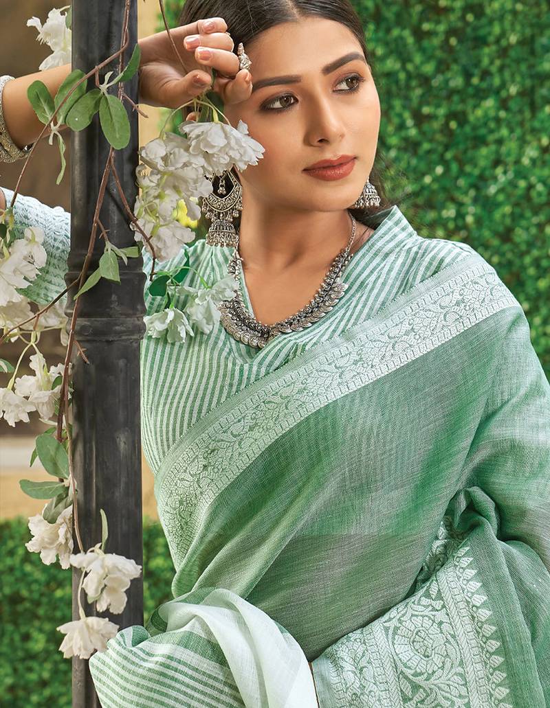 | Product Name | Rama Green Solid With Woven Border Linen Saree | |