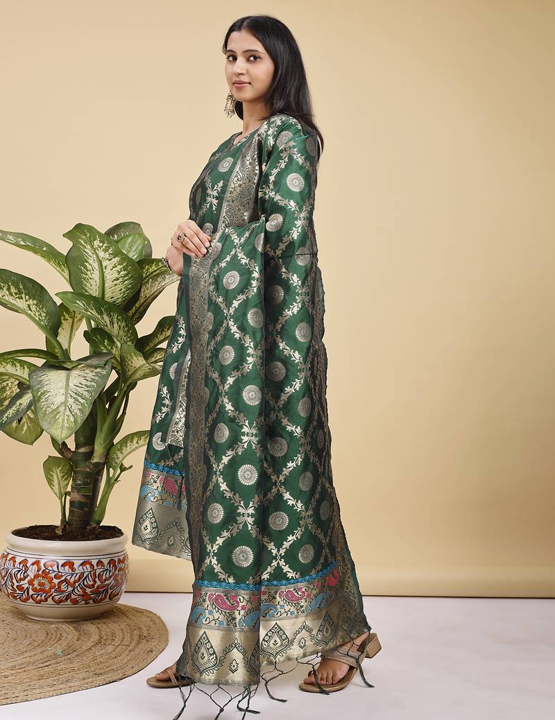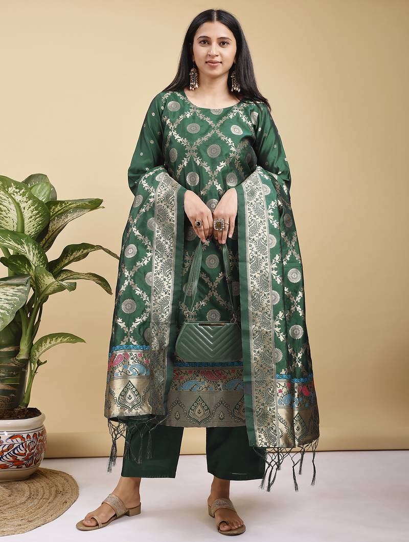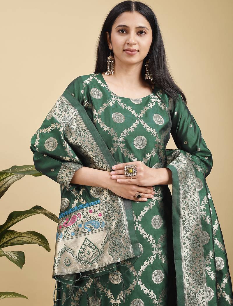 | Product Name | Readymade Green Color Pure Banarasi Silk Top Pent Dupatta Set | |