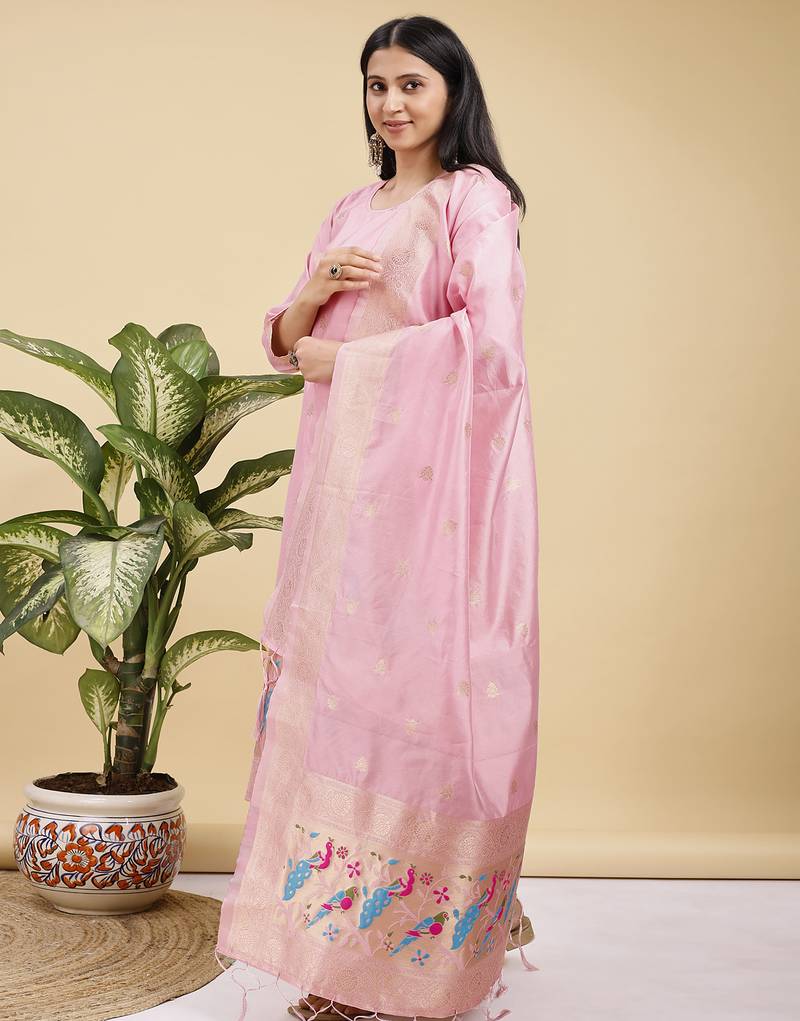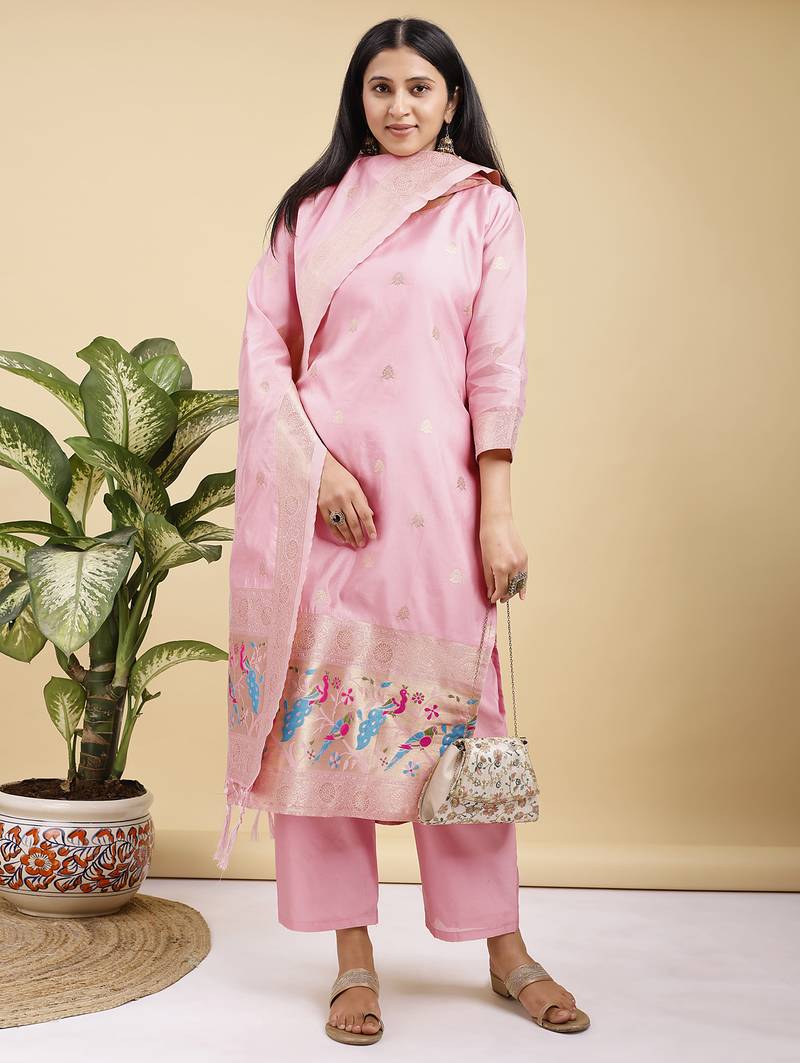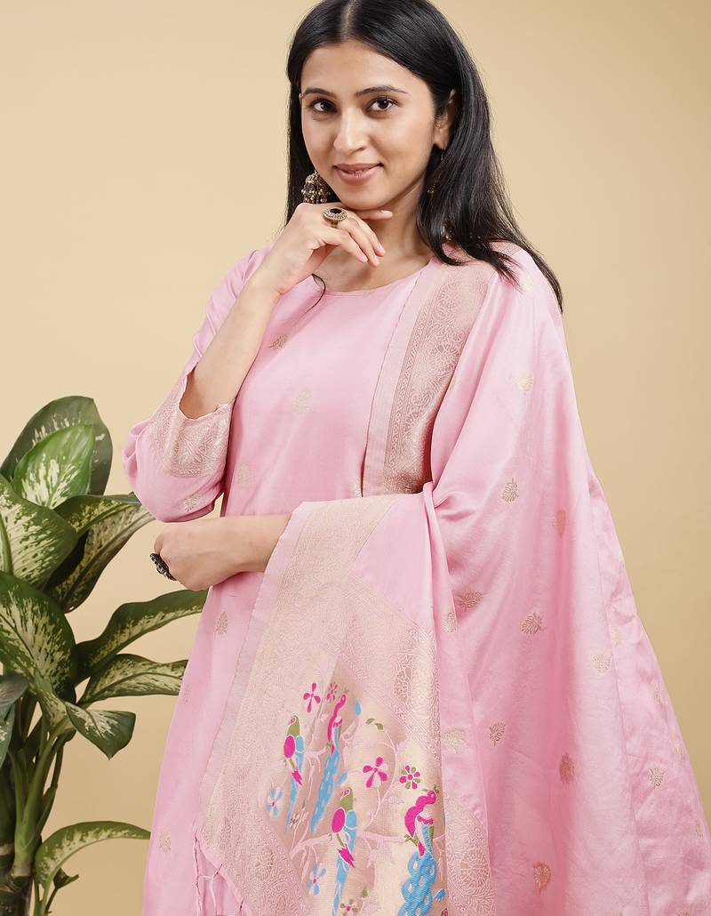 | Product Name | Readymade Pink Color Pure Banarasi Silk Top Pent Dupatta Set | |