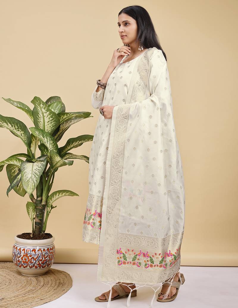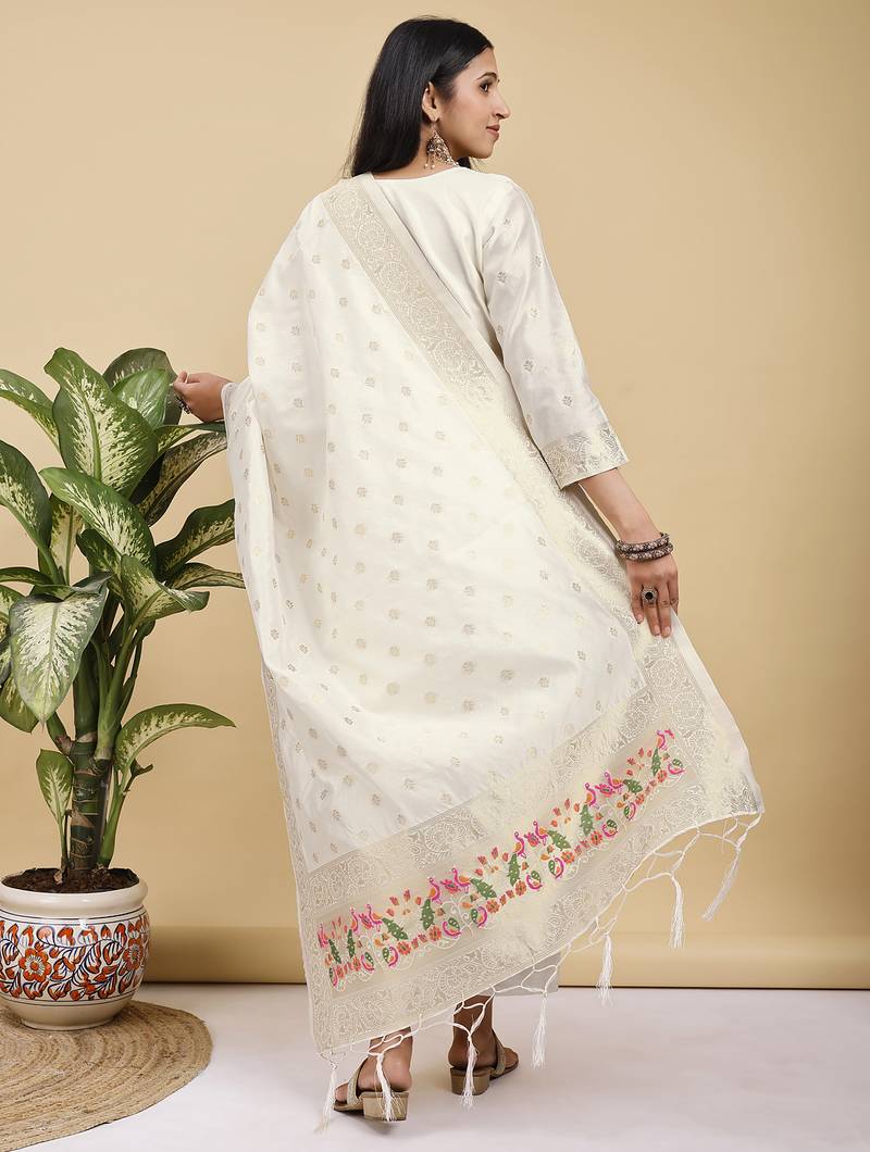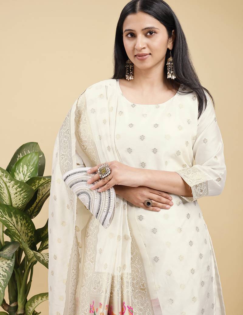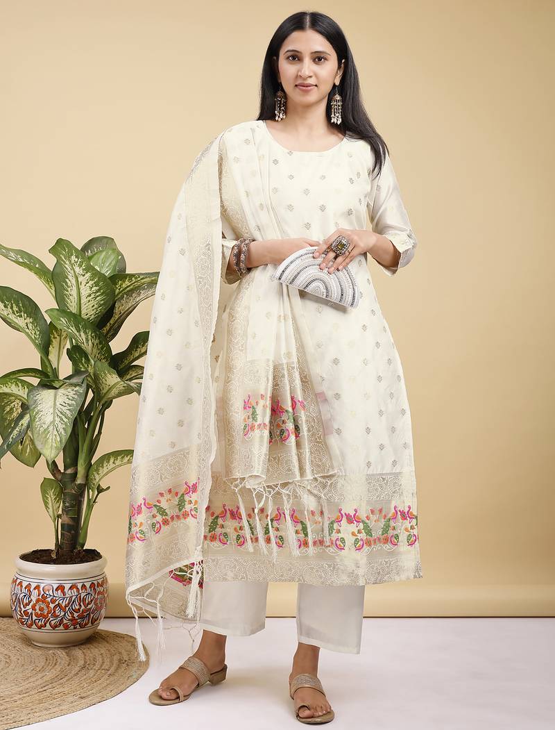| Product Name | Readymade White Color Pure Banarasi Silk Top Pent Dupatta Set | |