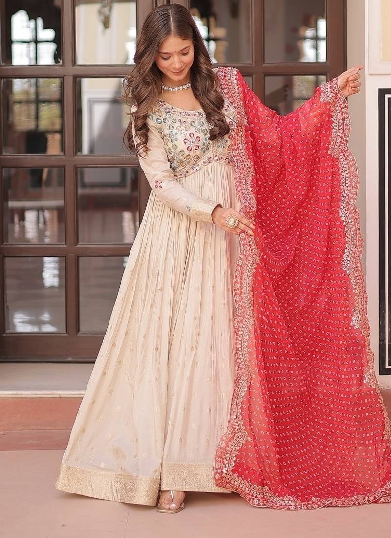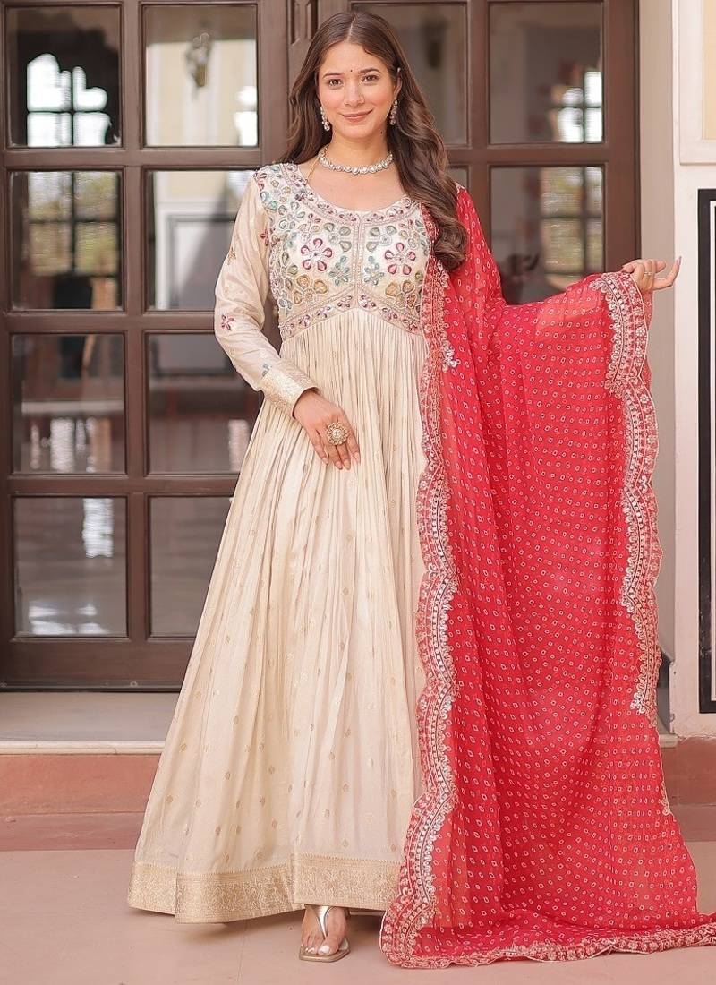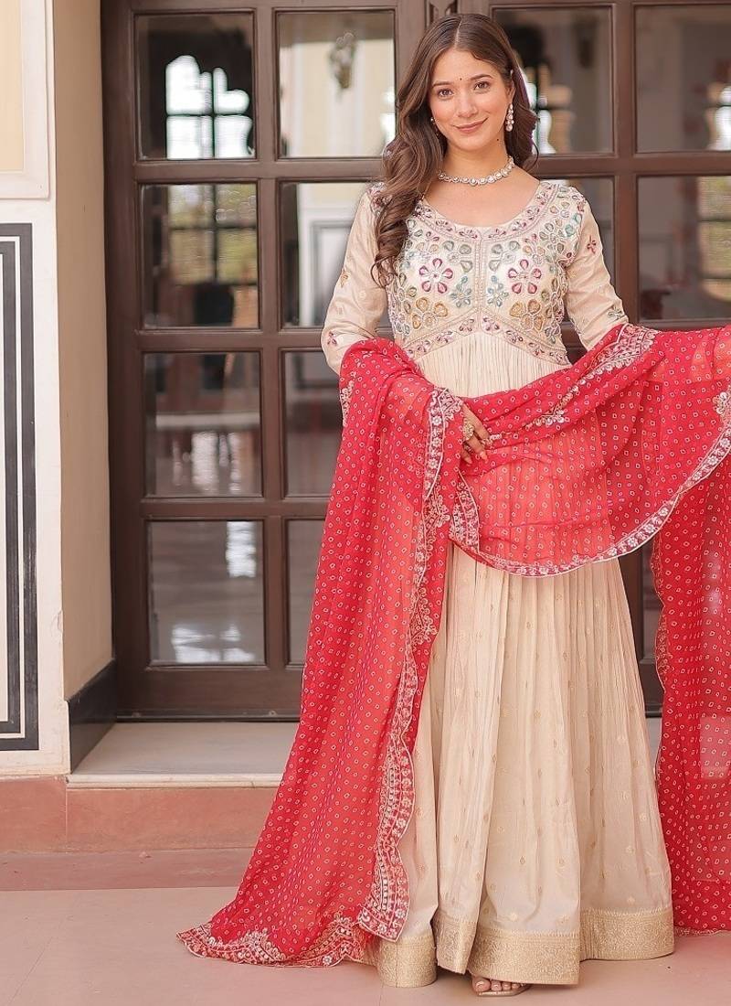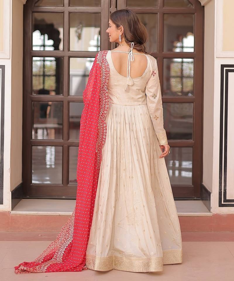 | Product Description | Experience The Allure Of Trending Cosmos Jequard Gown With Bandhani Printed Embroidered Cut Work Dupatta. Discover The Perfect Fusion Of Elegance And Grace. Shop Now For A Timeless Appearance.3 Mtr Flair Stitched With Canvas With Georgette With Bandhani Print With Embroidered Cut Work Dupatta. |