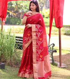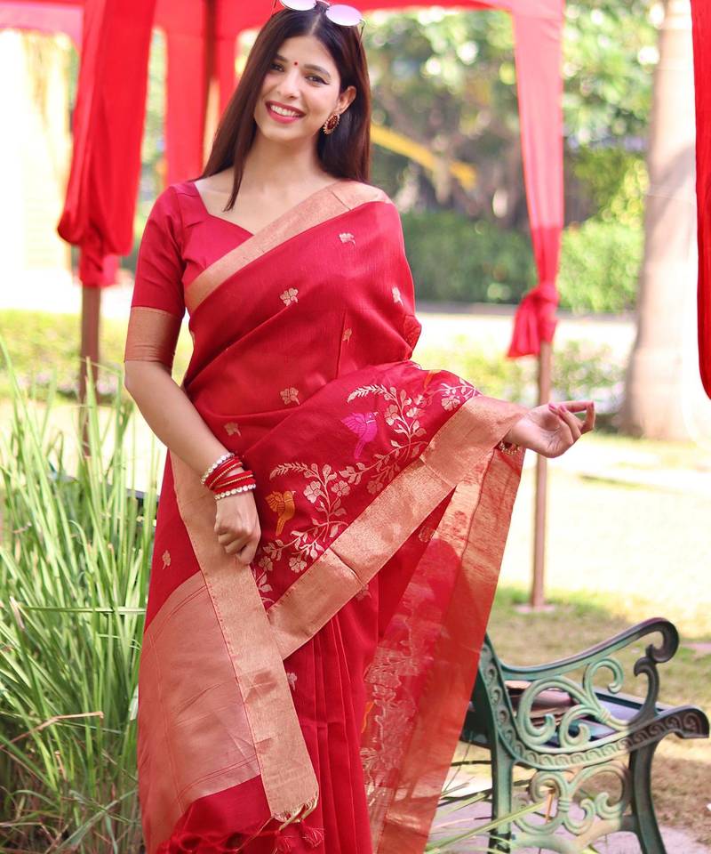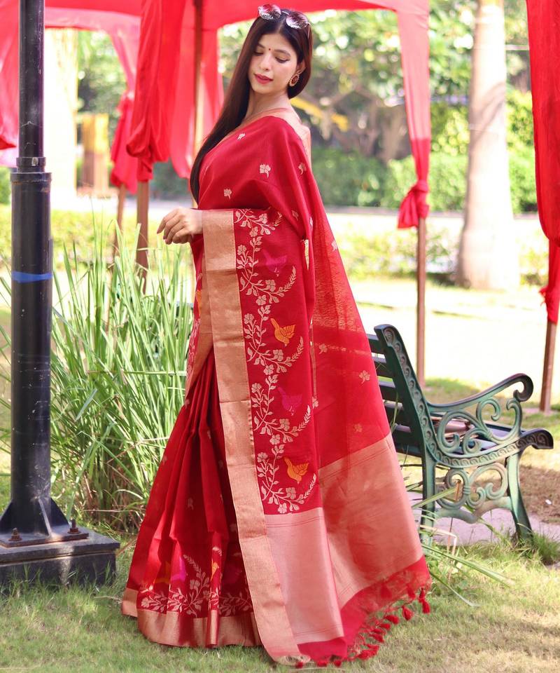 Red color pure linen silk jamdani type weaving border saree with blouse