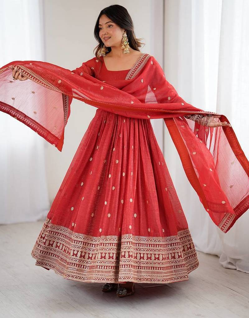 Rust color zari sequince embroidered crunchy silk gown dupatta stitched