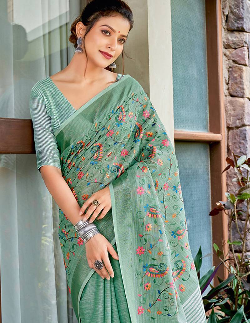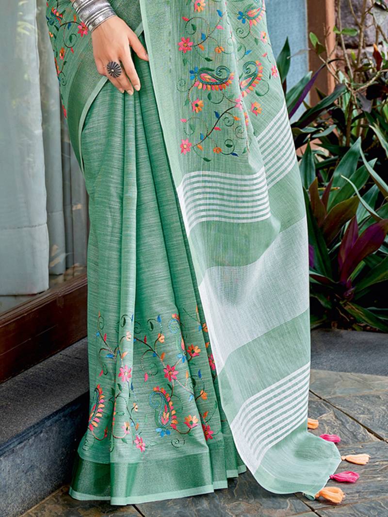 Sea green color embroidered & zari border linen saree with blouse