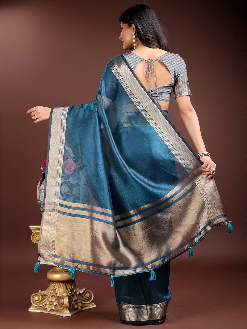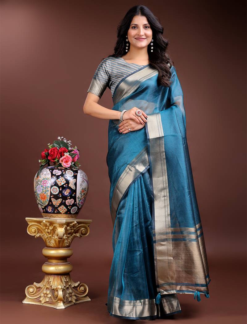 | Product Name | Blue Color Solid Zari Border Plain Orgenza Saree | |